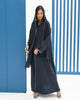Abaya made of Nada fabric, featuring a flowy design with wide sleeves, adorned with white wavy edges, and paired with a matching sheila with the same details.