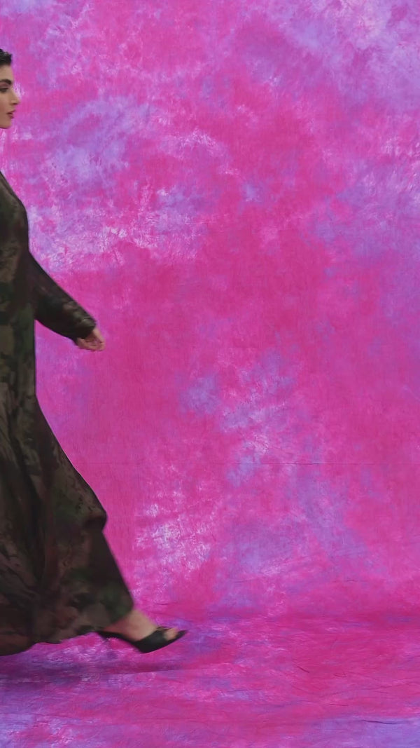 blends quiet elegance with soft strength. Crafted from a flowing sheer fabric inspired by deep natural tones of forest green and earthy hues, it creates a refined and mysterious look. The open-front silhouette reveals a light inner layer, offering a beautiful contrast and effortless sophistication. Perfect for elevated occasions or chic day-to-evening wear, this abaya reflects modern femininity with timeless grace.