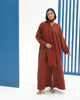 Elegant mahogany abaya with a modern loose fit, designed for both comfort and style. Features a matching scarf and delicate embroidery on the sleeves for a sophisticated look