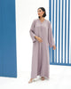 An elegant abaya crafted from luxurious crepe fabric with a subtle textured pattern, featuring a flowy design with wide sleeves and side slits, complemented by modern snap buttons on the front.