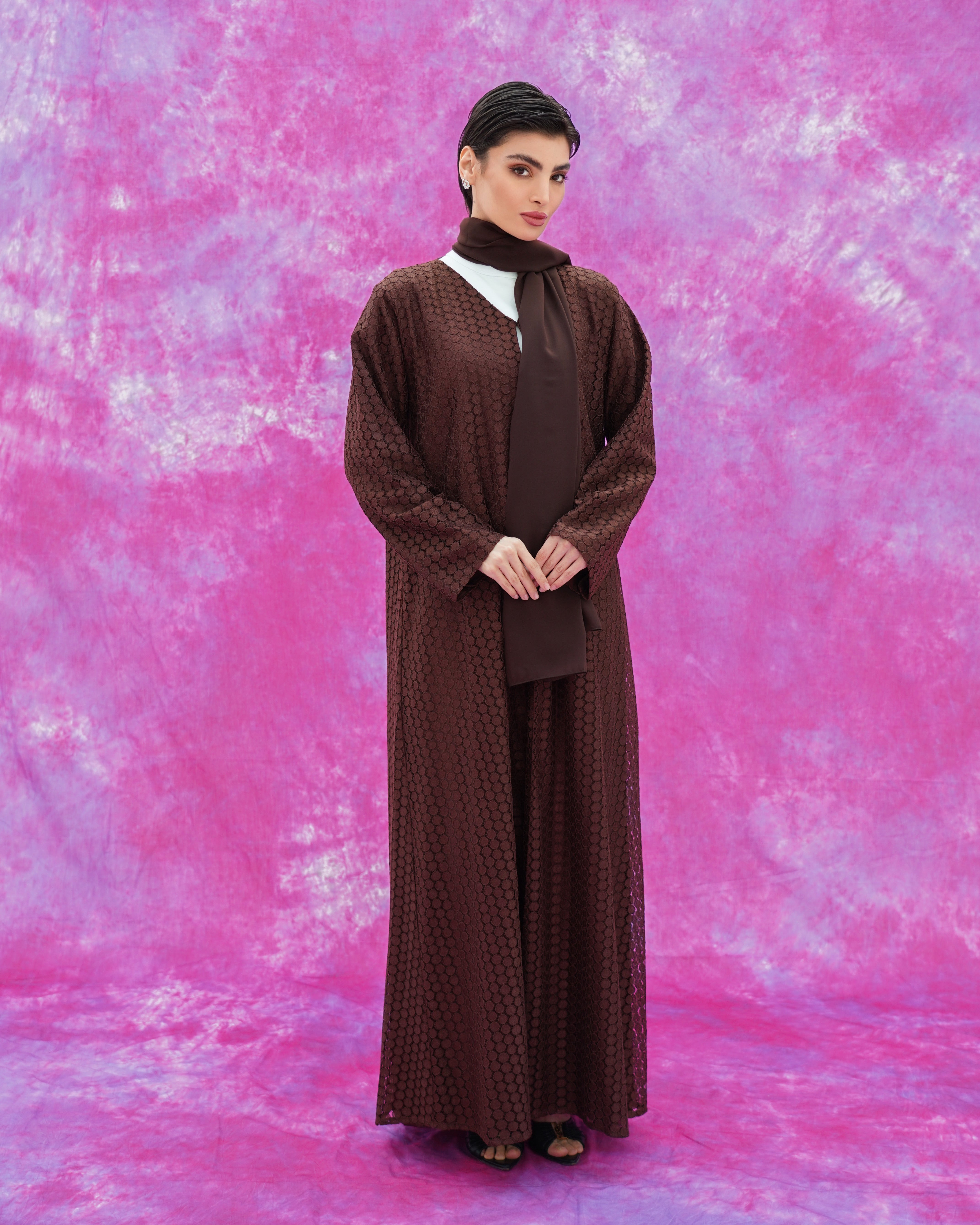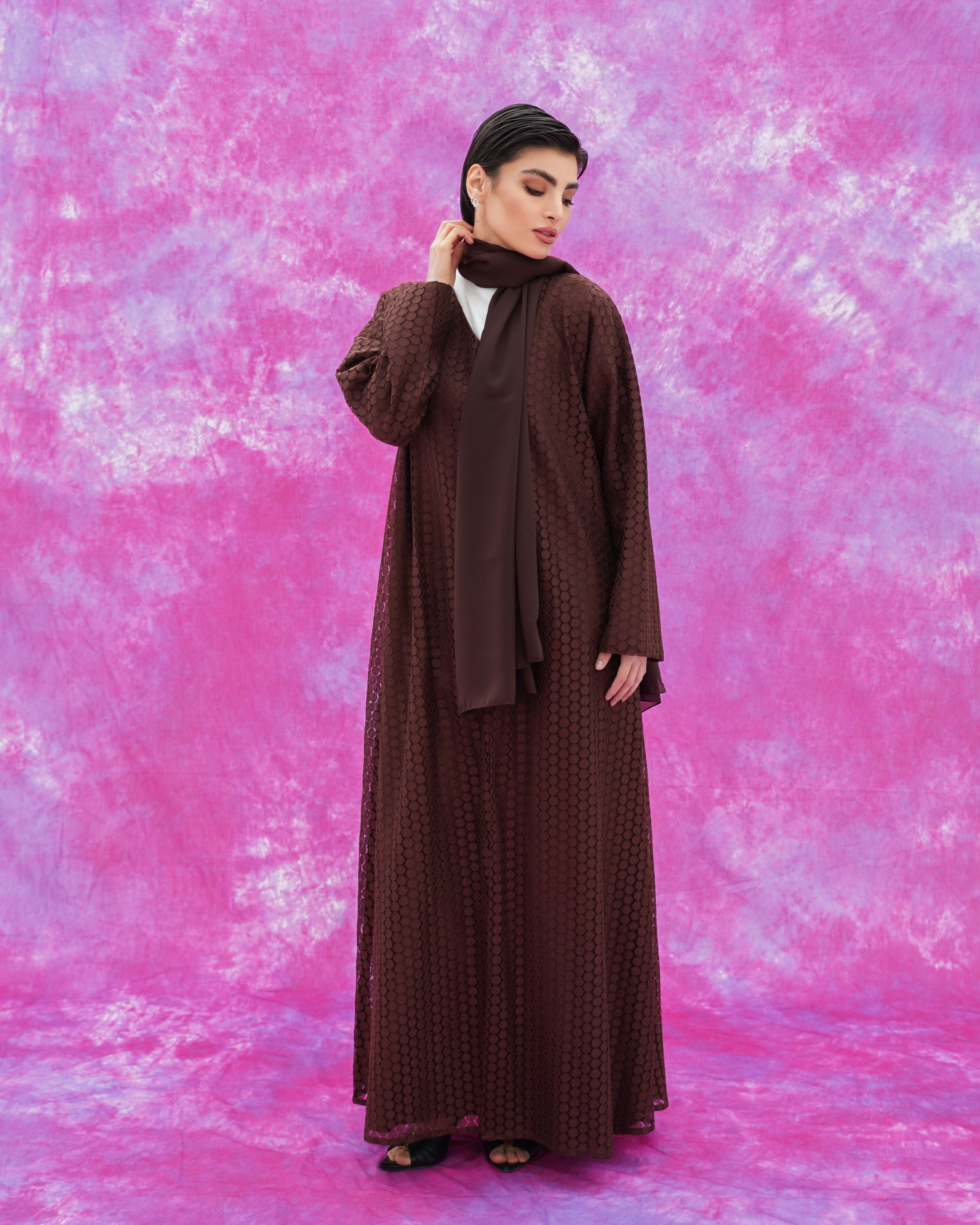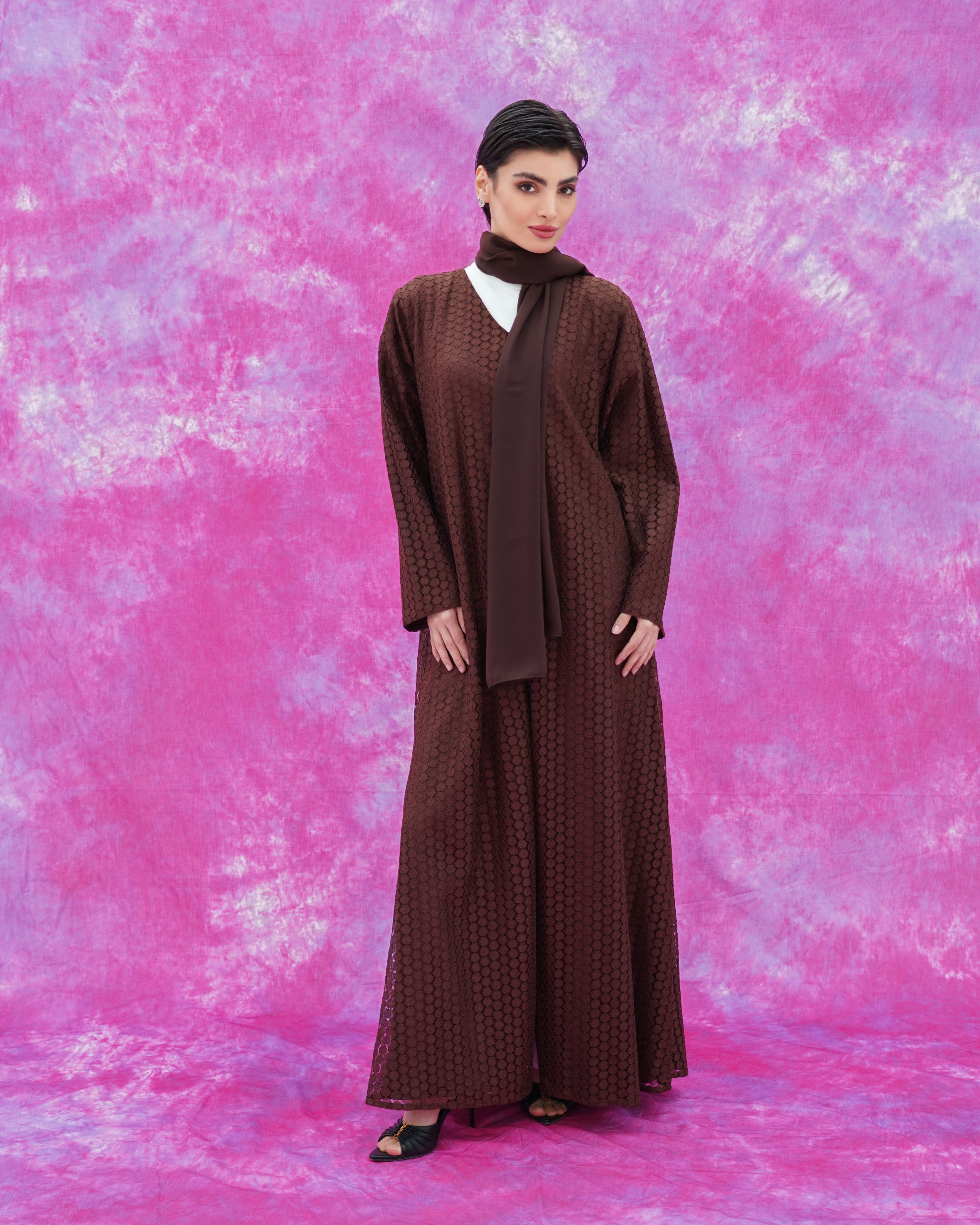 عباية باللون البني الداكن مصممة من قماش دانتيل فاخر بنقشة بارزة أنيقة تضيف لمسة فخامة هادئة. تتميز بقصّة انسيابية مريحة وأكمام واسعة تمنح حرية حركة وأناقة متوازنة. خيار مثالي للإطلالات الراقية في المناسبات أو للاستخدام اليومي بأسلوب عصري راقٍ.