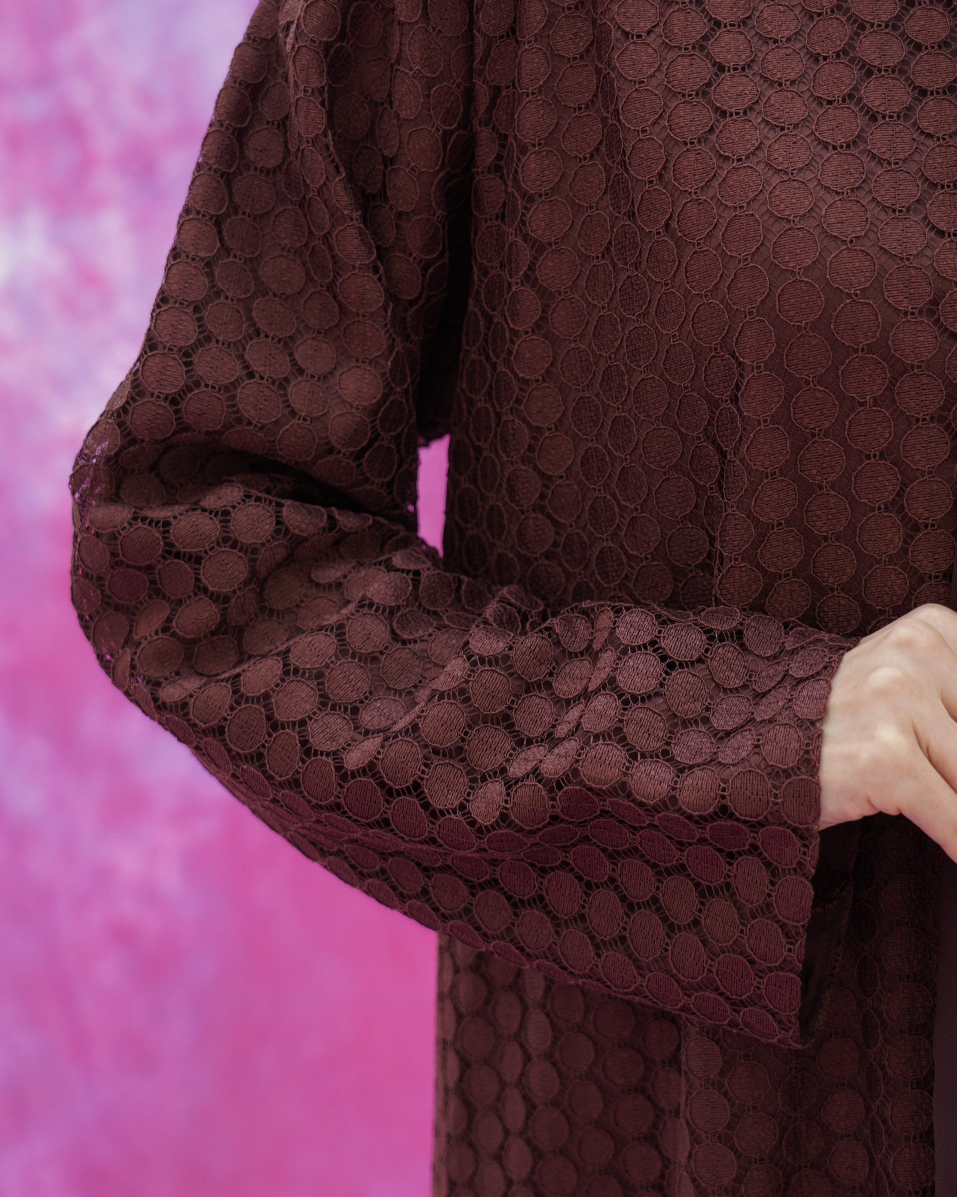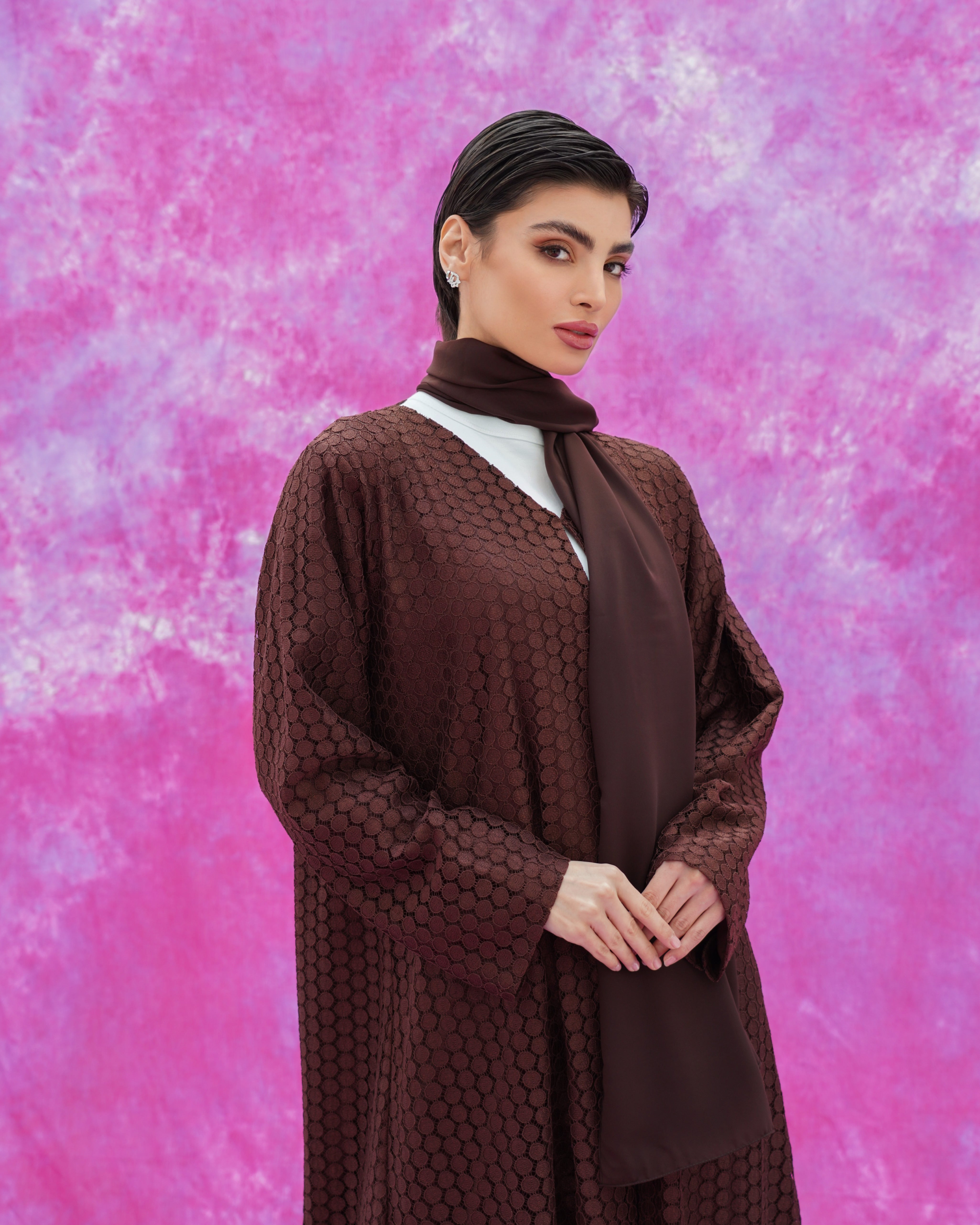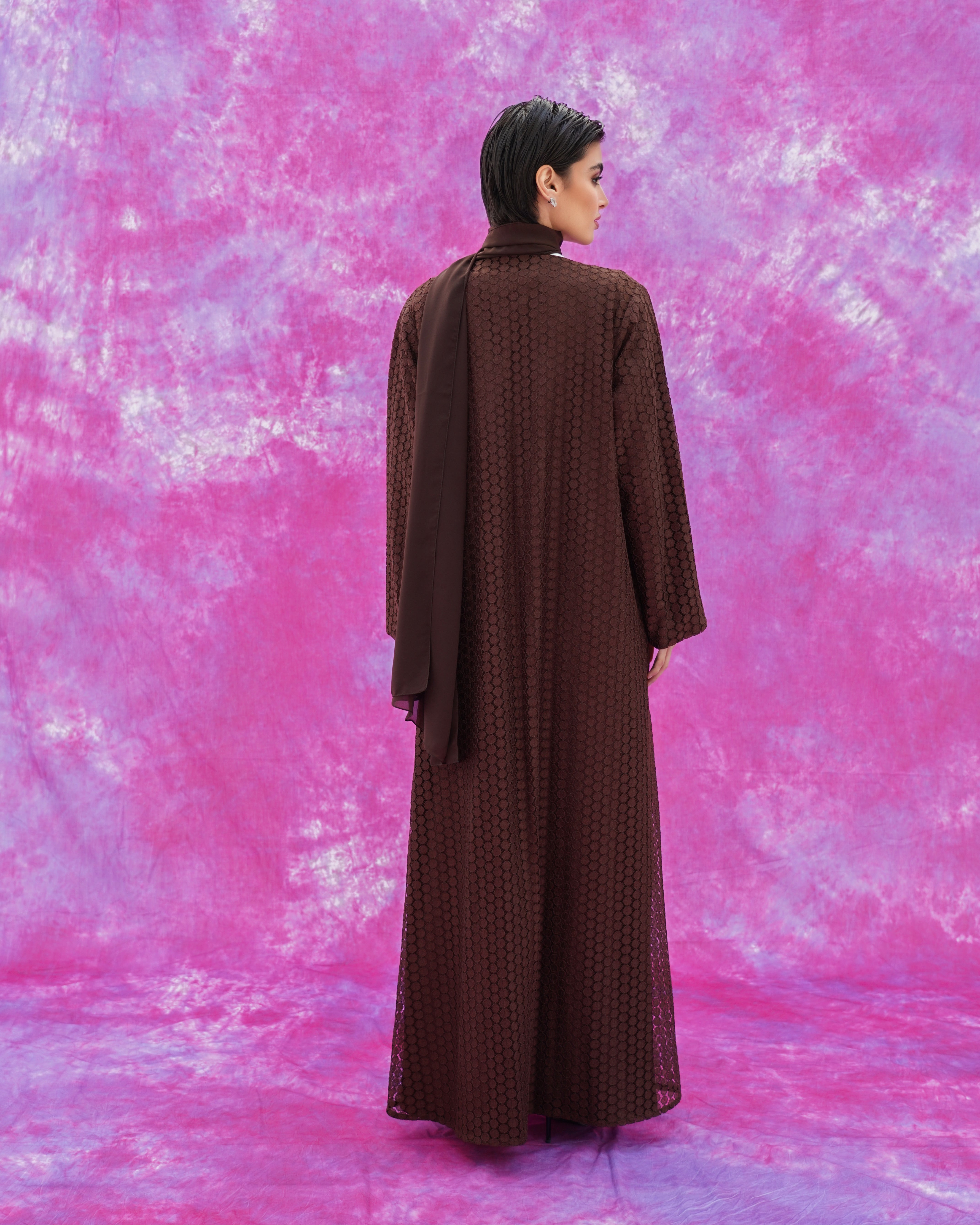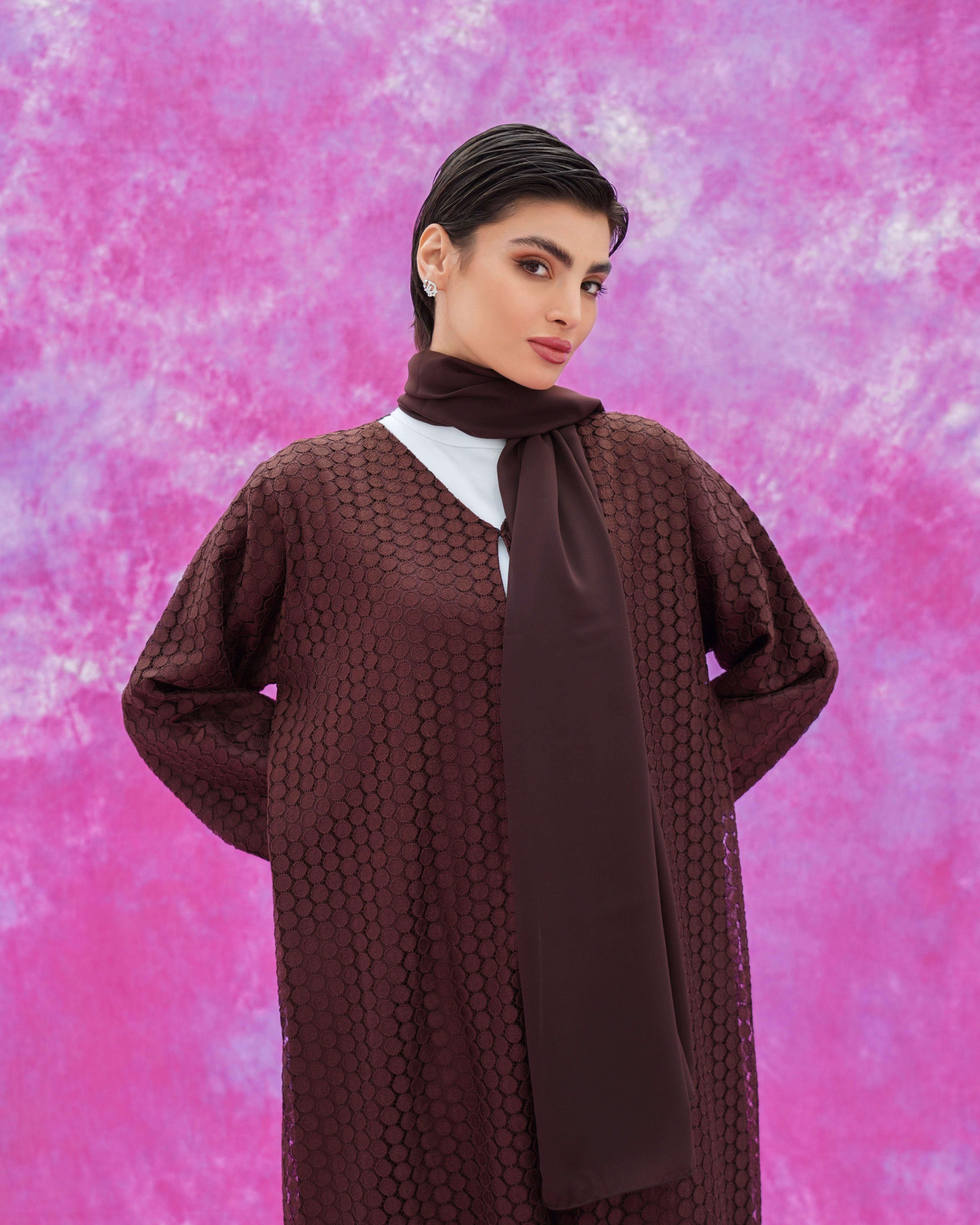 عباية باللون البني الداكن مصممة من قماش دانتيل فاخر بنقشة بارزة أنيقة تضيف لمسة فخامة هادئة. تتميز بقصّة انسيابية مريحة وأكمام واسعة تمنح حرية حركة وأناقة متوازنة. خيار مثالي للإطلالات الراقية في المناسبات أو للاستخدام اليومي بأسلوب عصري راقٍ.