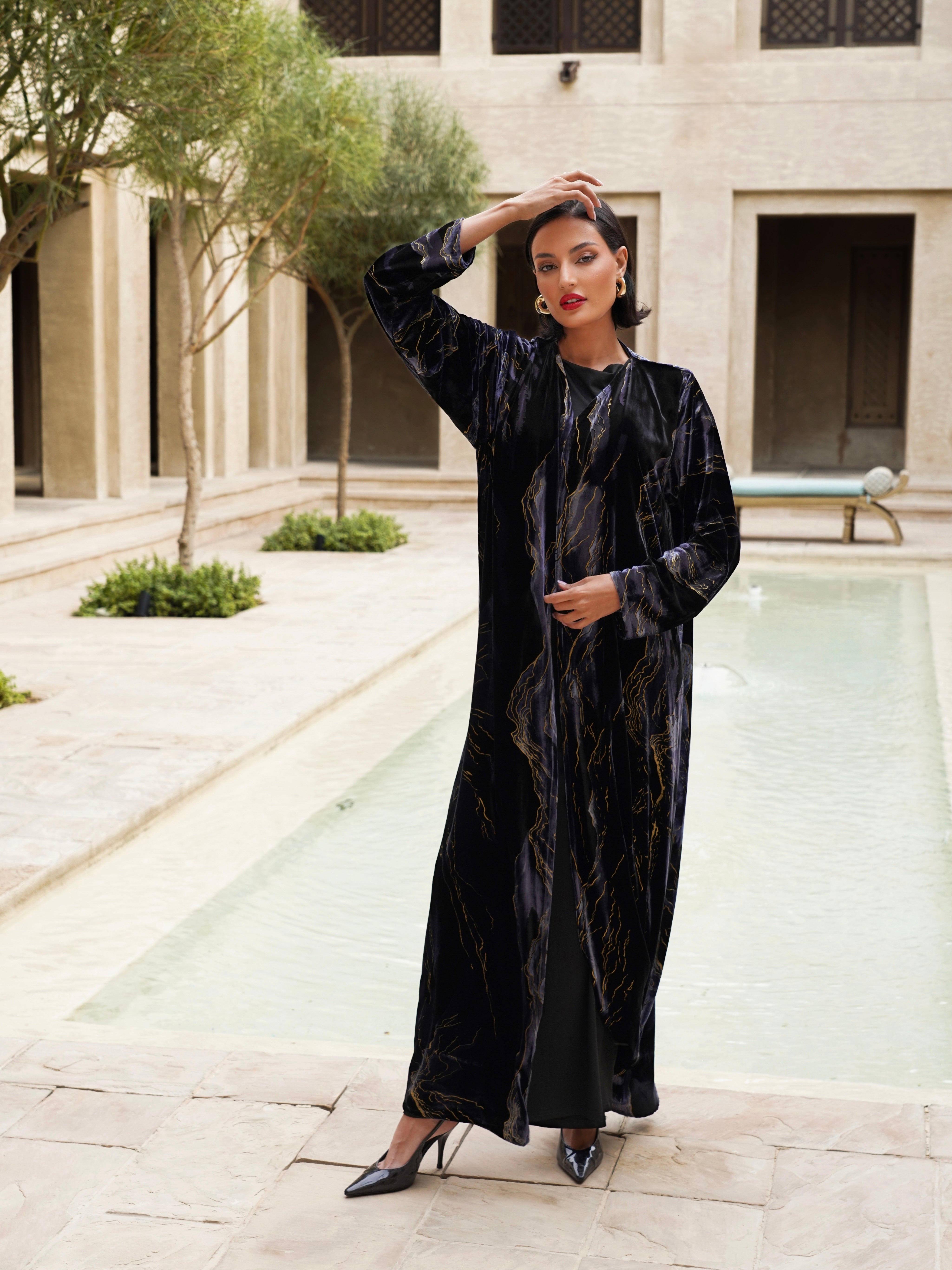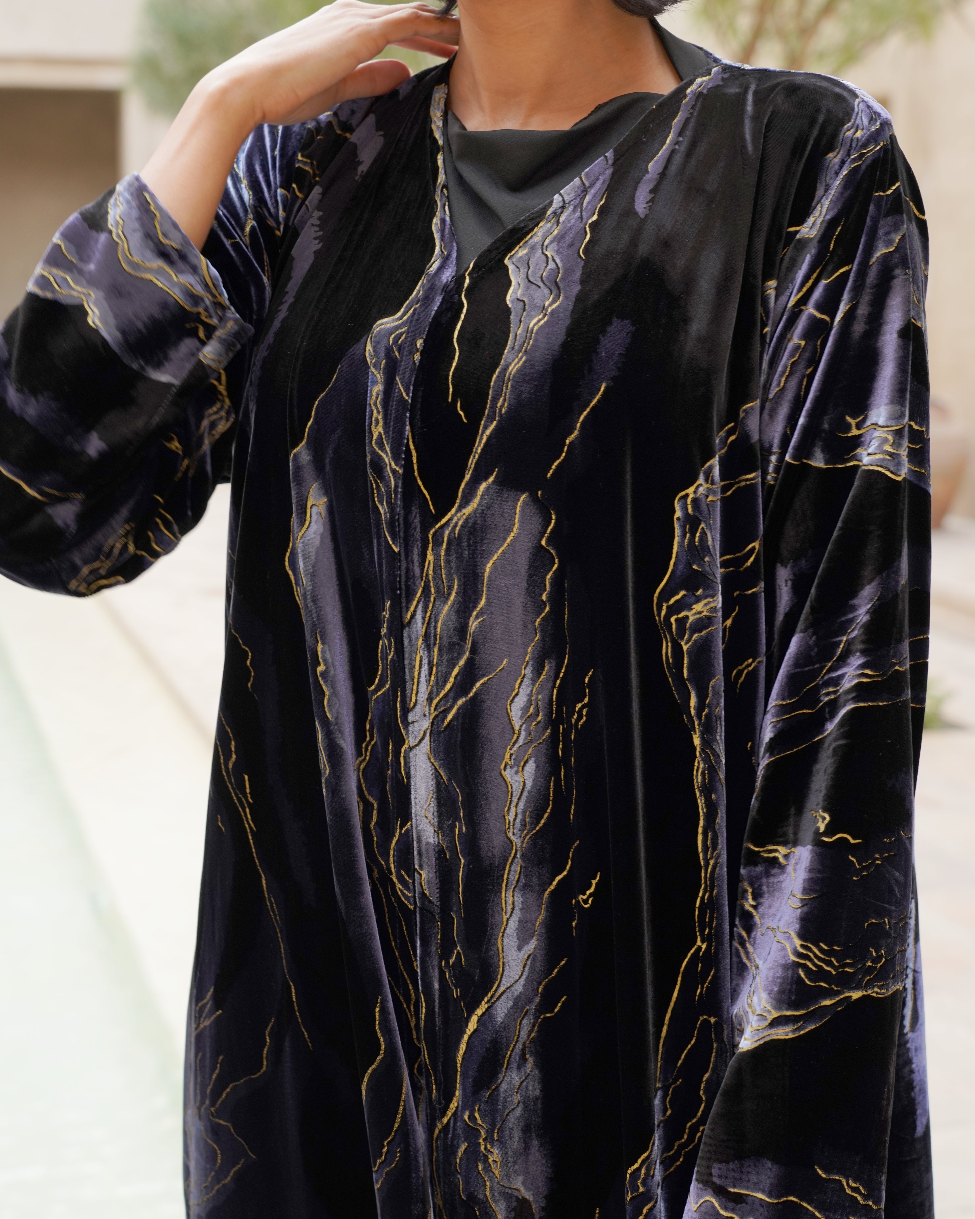 A printed abaya made from luxurious velvet fabric, featuring elegant printed patterns and motifs that add a touch of sophistication and elegance, perfect for refined looks.