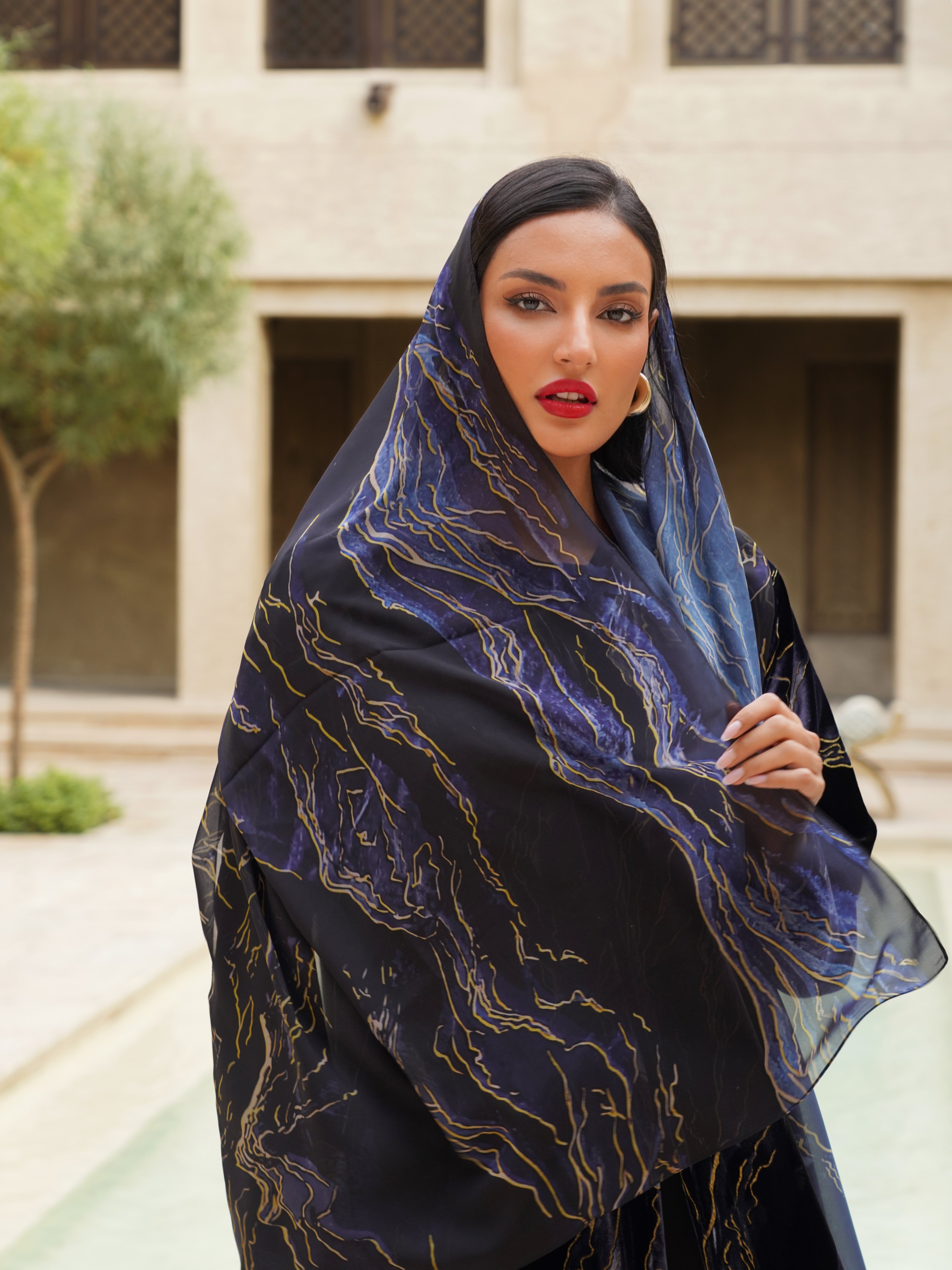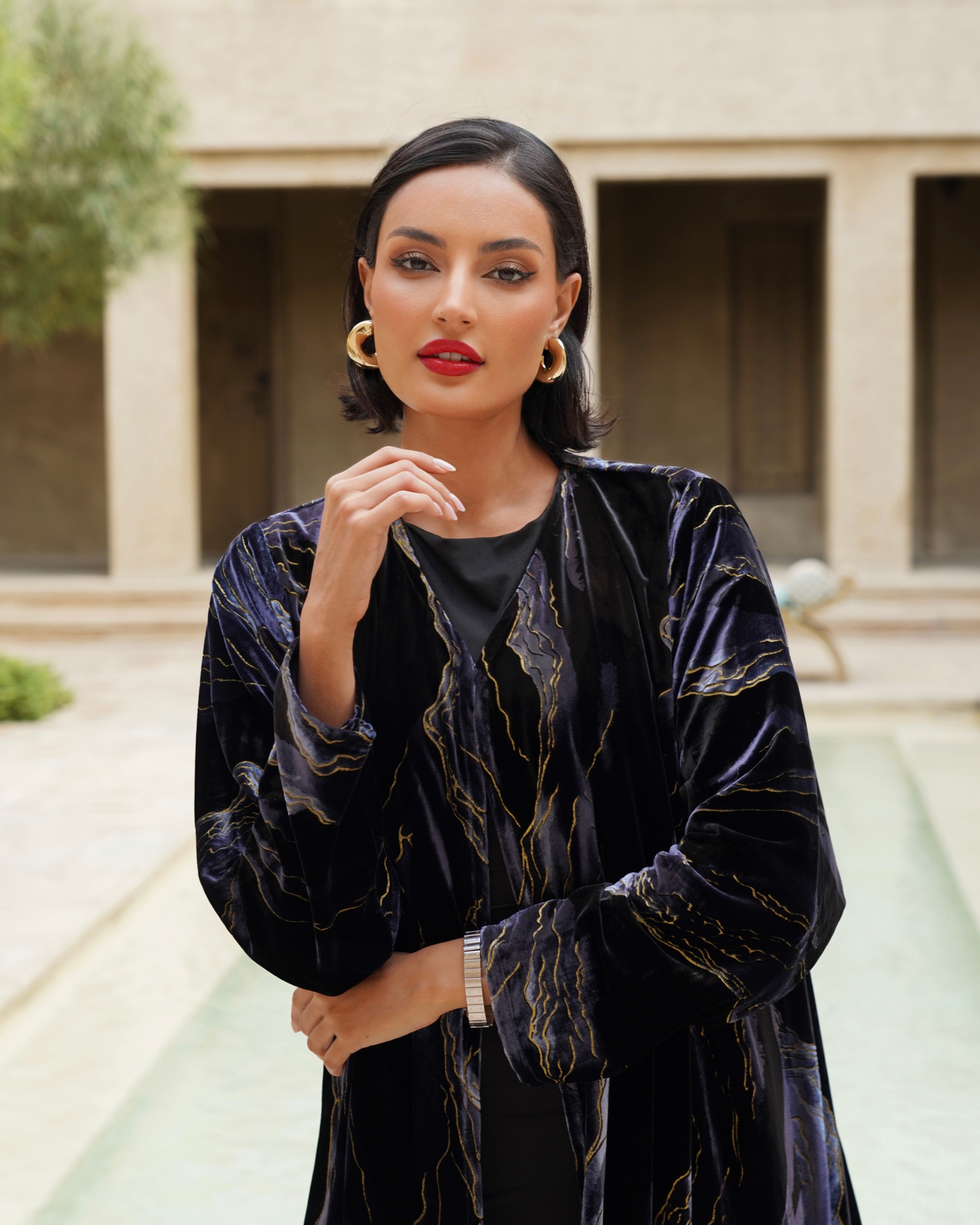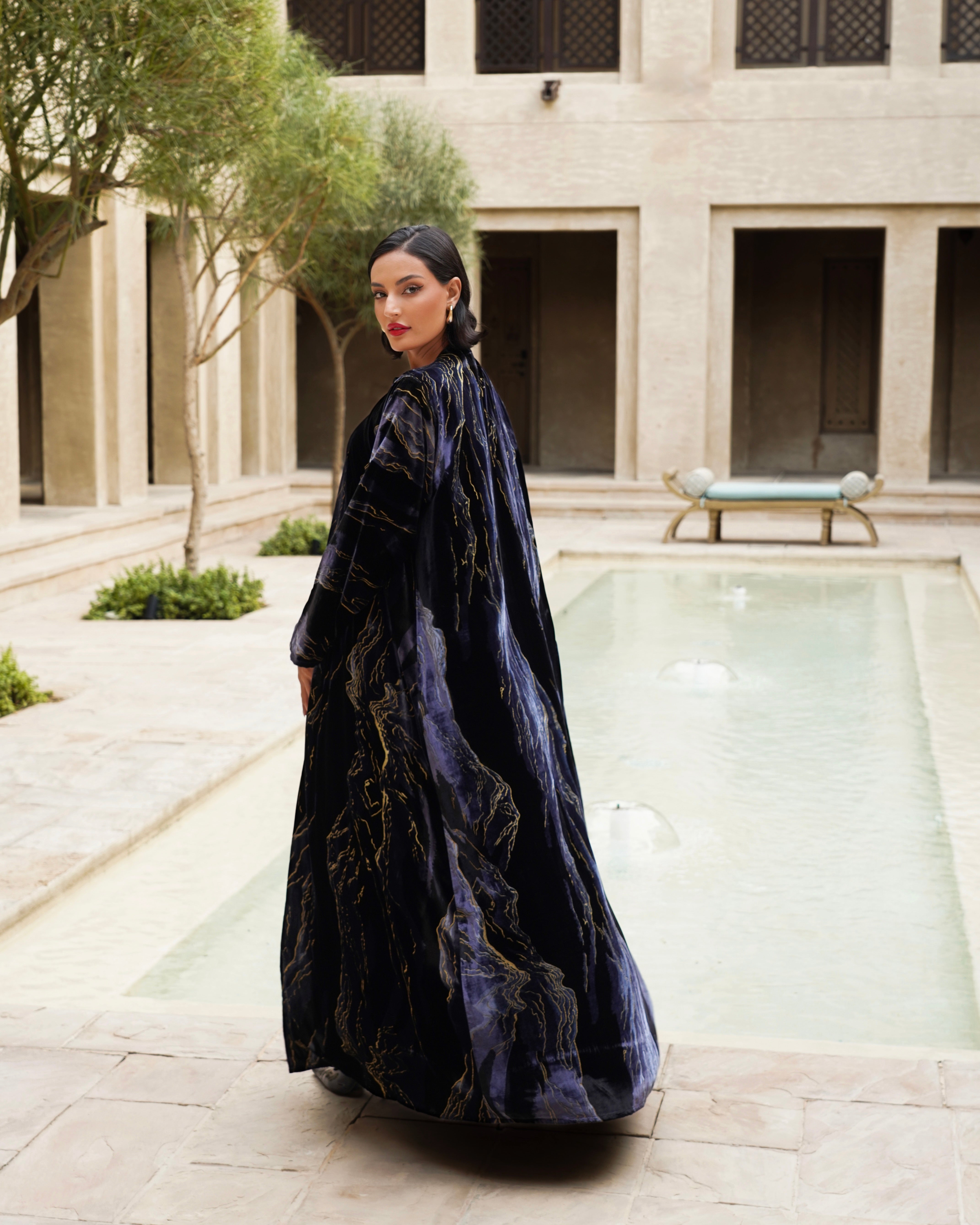 عباية برنت مصنوعة من قماش مخمل فاخر، بتصميم أنيق مع نقشات وأشكال مطبوعة تضيف لمسة