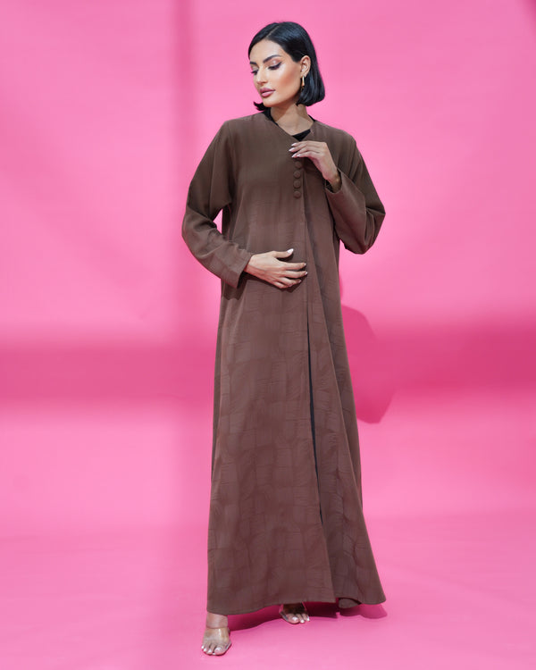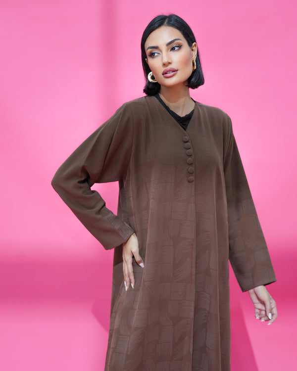 sophisticated abaya, featuring a subtle textured pattern .Designed with a clean V-neckline and covered buttons down the front, this abaya offers both style and modesty. Made from lightweight, breathable fabric, it's perfect for both everyday wear and special occasions.