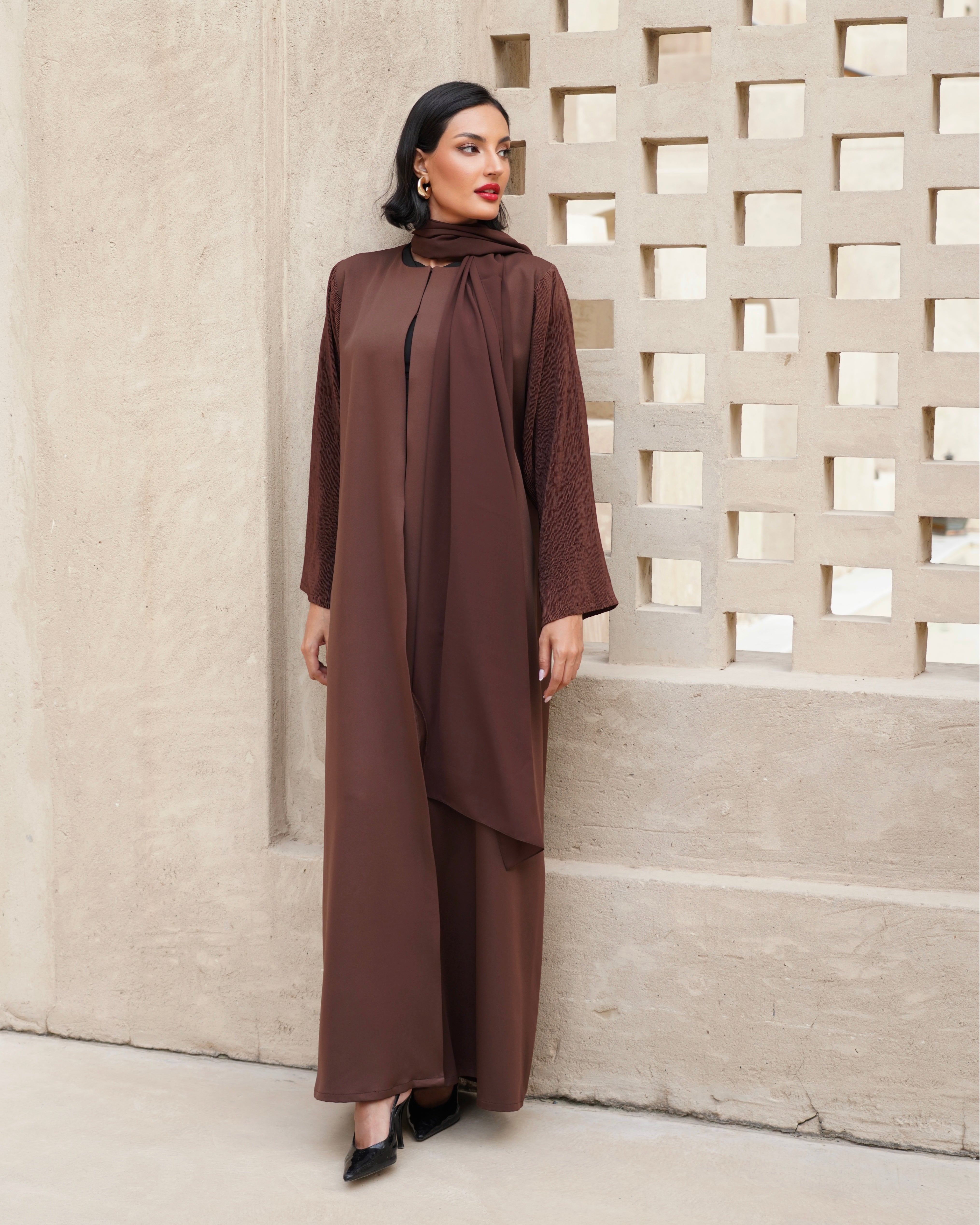 عباية أنيقة من قماش كريب ناعم، بأكمام من قماش مختلف بملمس خفيف يضيف لمسة راقية للتصميم. قصة بسيطة وانسيابية تناسب مختلف الإطلالات.