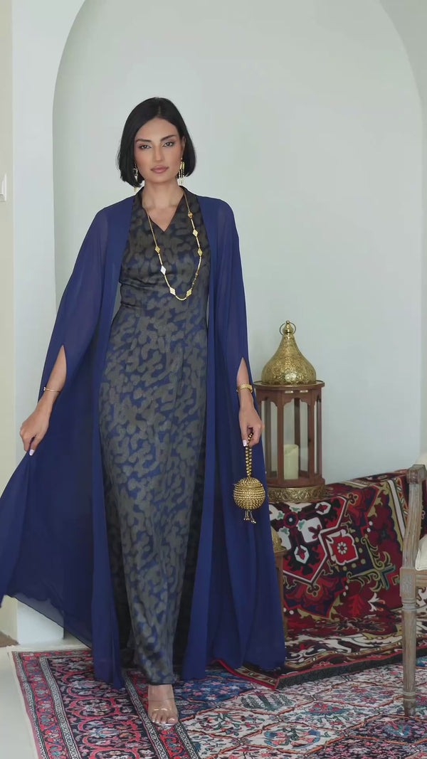 بدرجة كحلية ناعمة، يتميز بقصة أنثوية راقية و شيفون خفيفة تضيف نعومة وأناقة للإطلالة.