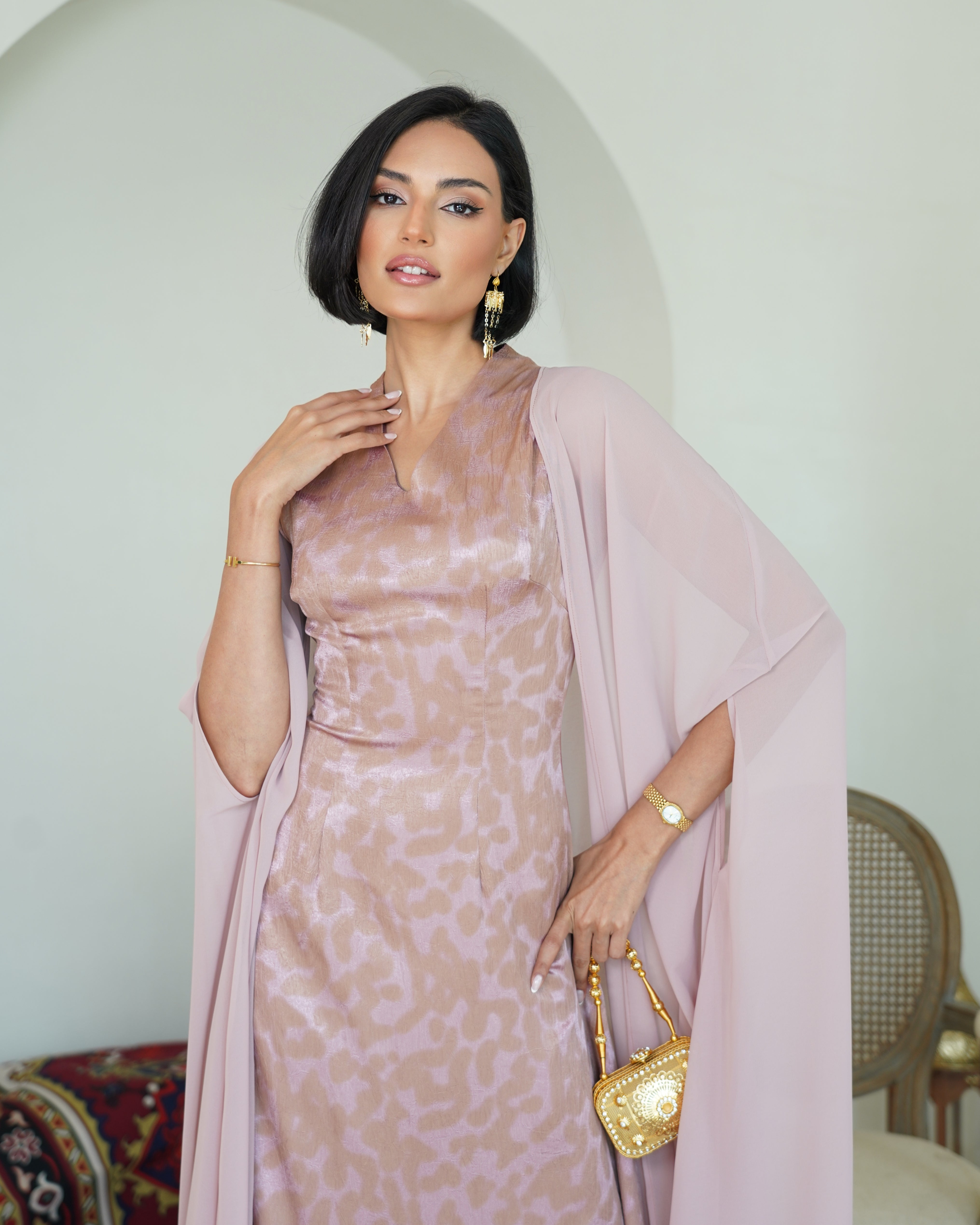 بدرجة وردية ناعمة، يتميز بقصة أنثوية راقية و شيفون خفيفة تضيف نعومة وأناقة للإطلالة.