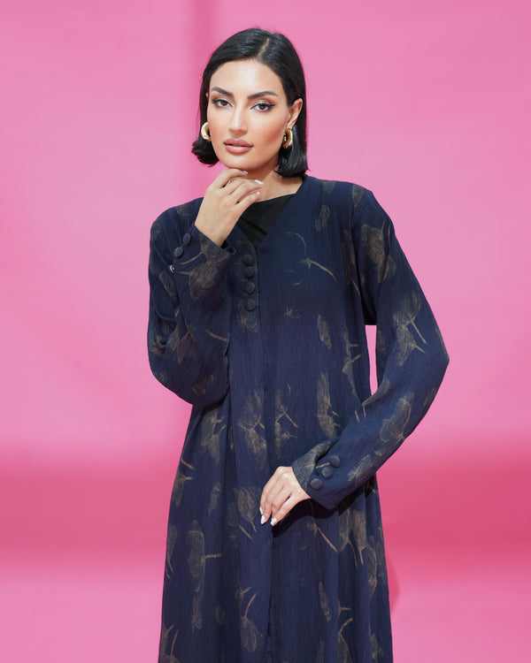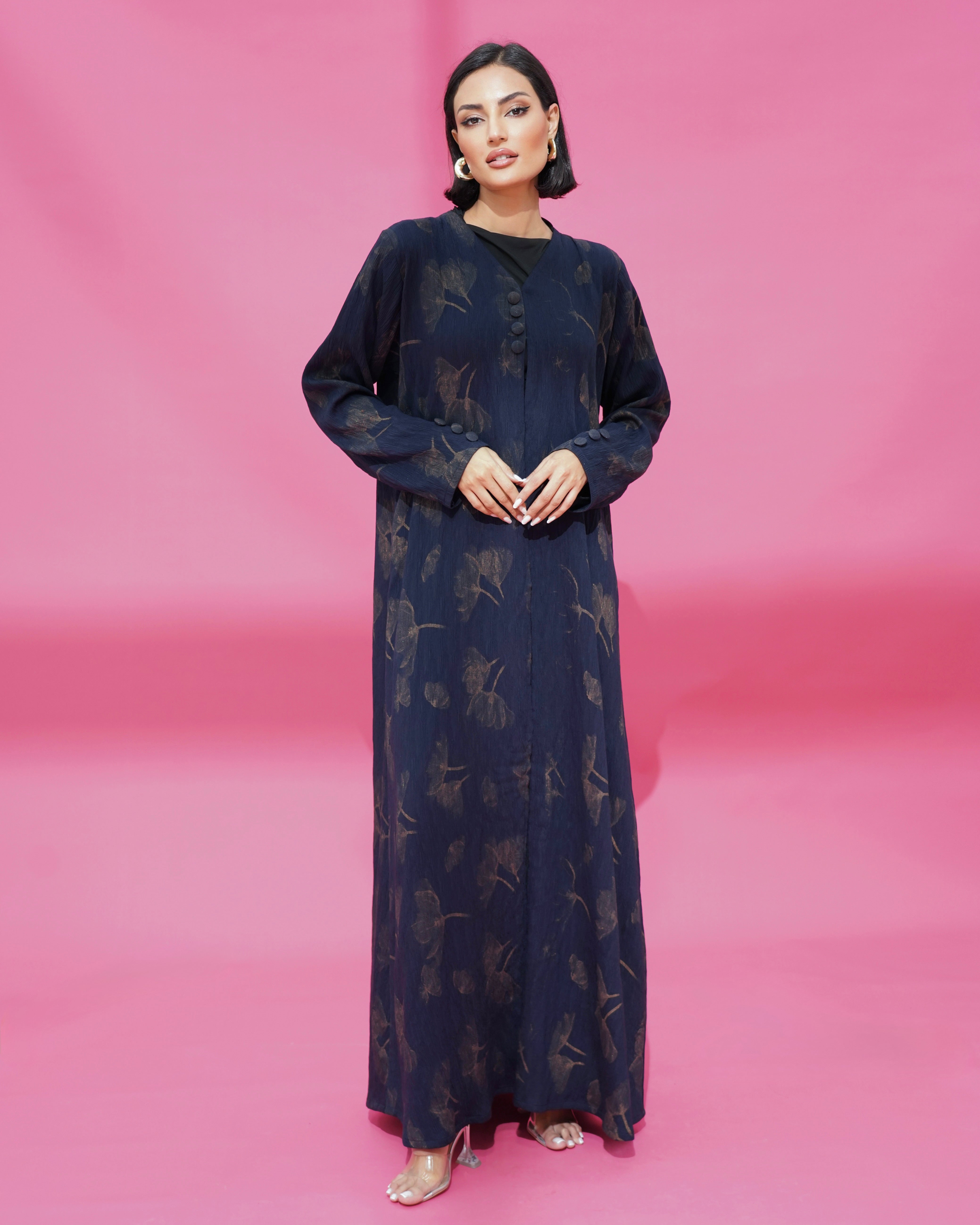 أضيفي لمسة من الأناقة الراقية إلى إطلالتك مع هذه العباية المصممة من قماش فاخر بملمس مجعّد ونقشة زهرية ناعمة. تتميز بتصميم أنثوي أنيق مع أزرار أمامية مغطاة بالقماش تضيف لمسة كلاسيكية راقية، وأكمام واسعة مزينة بأزرار مطابقة عند الأطراف.