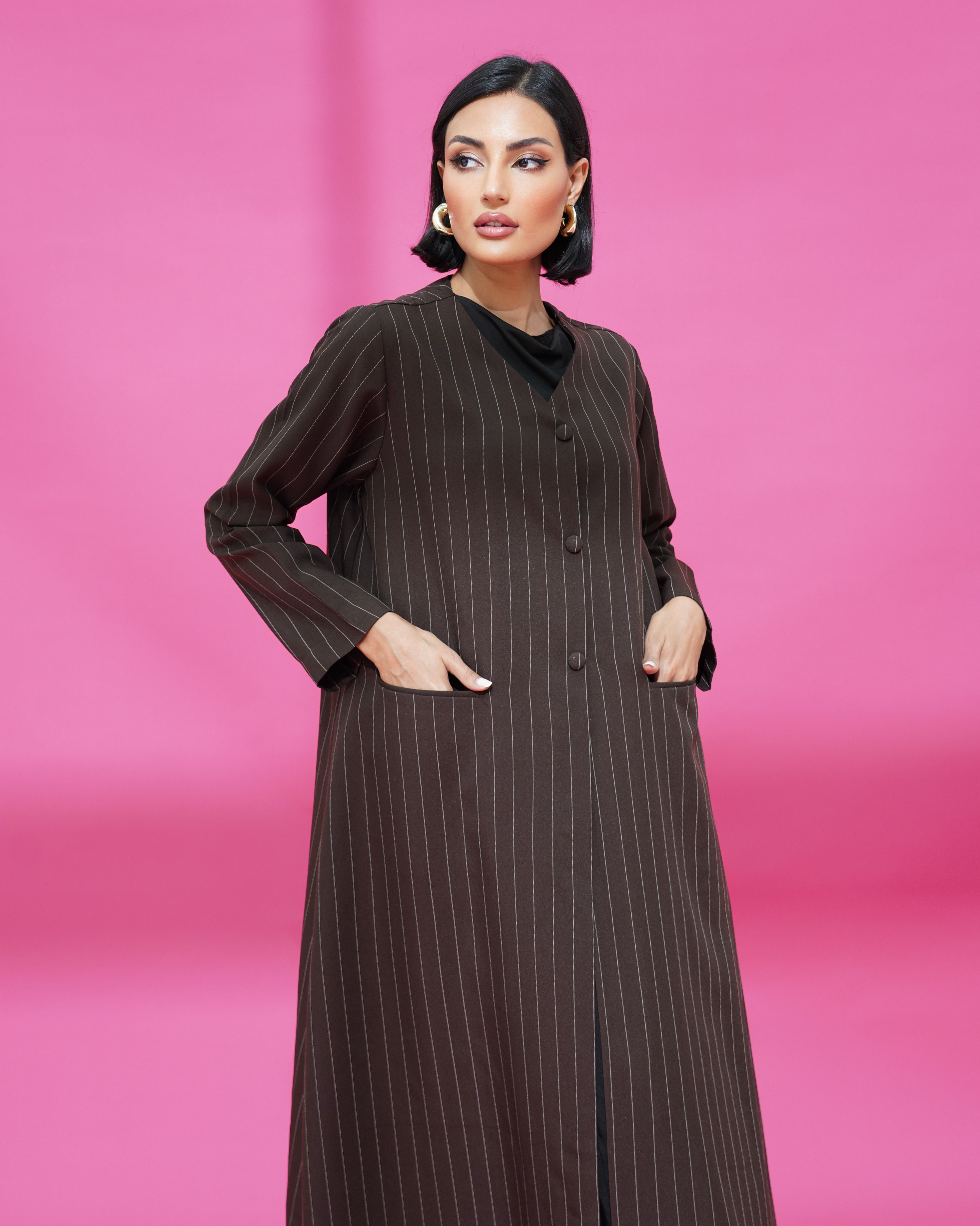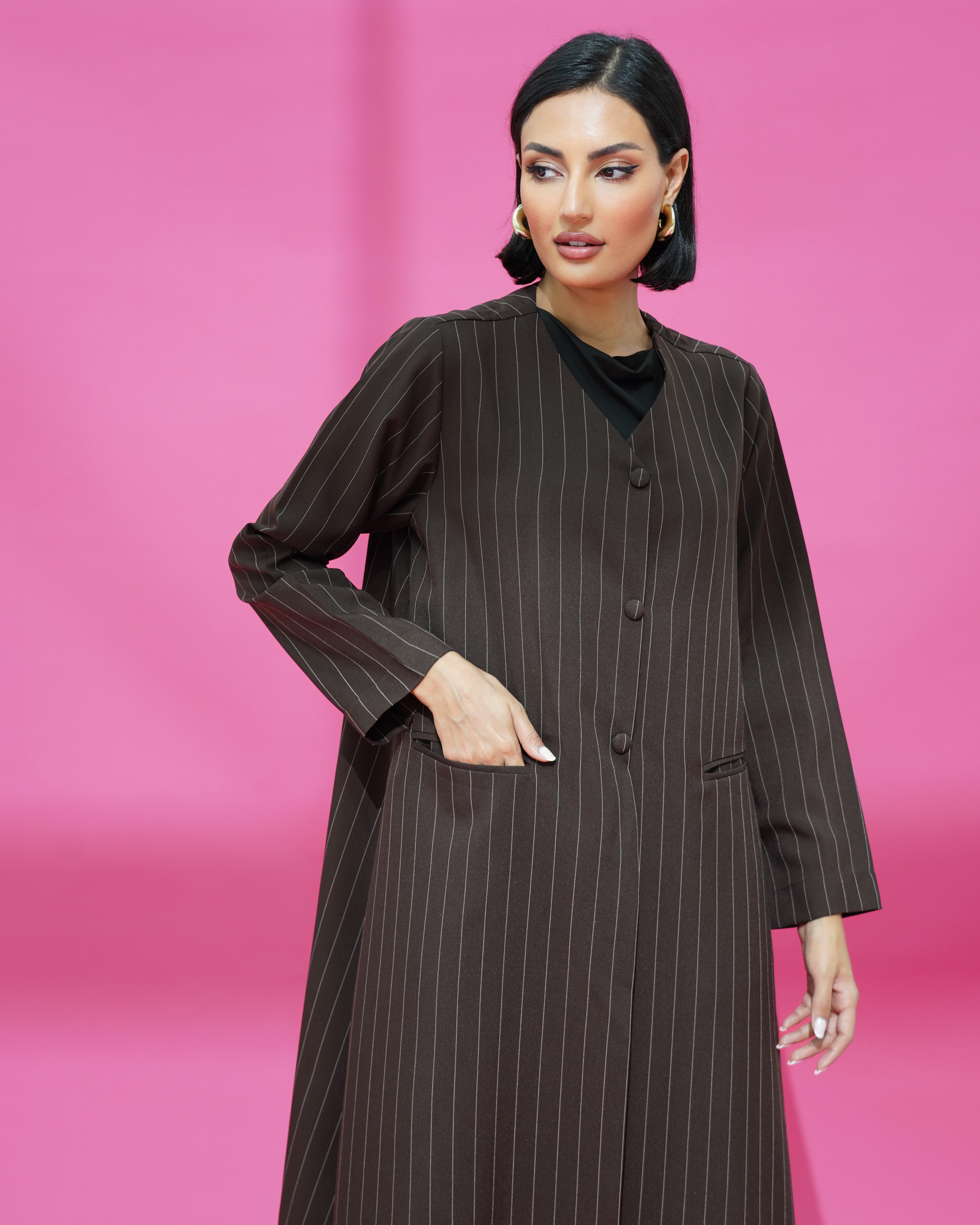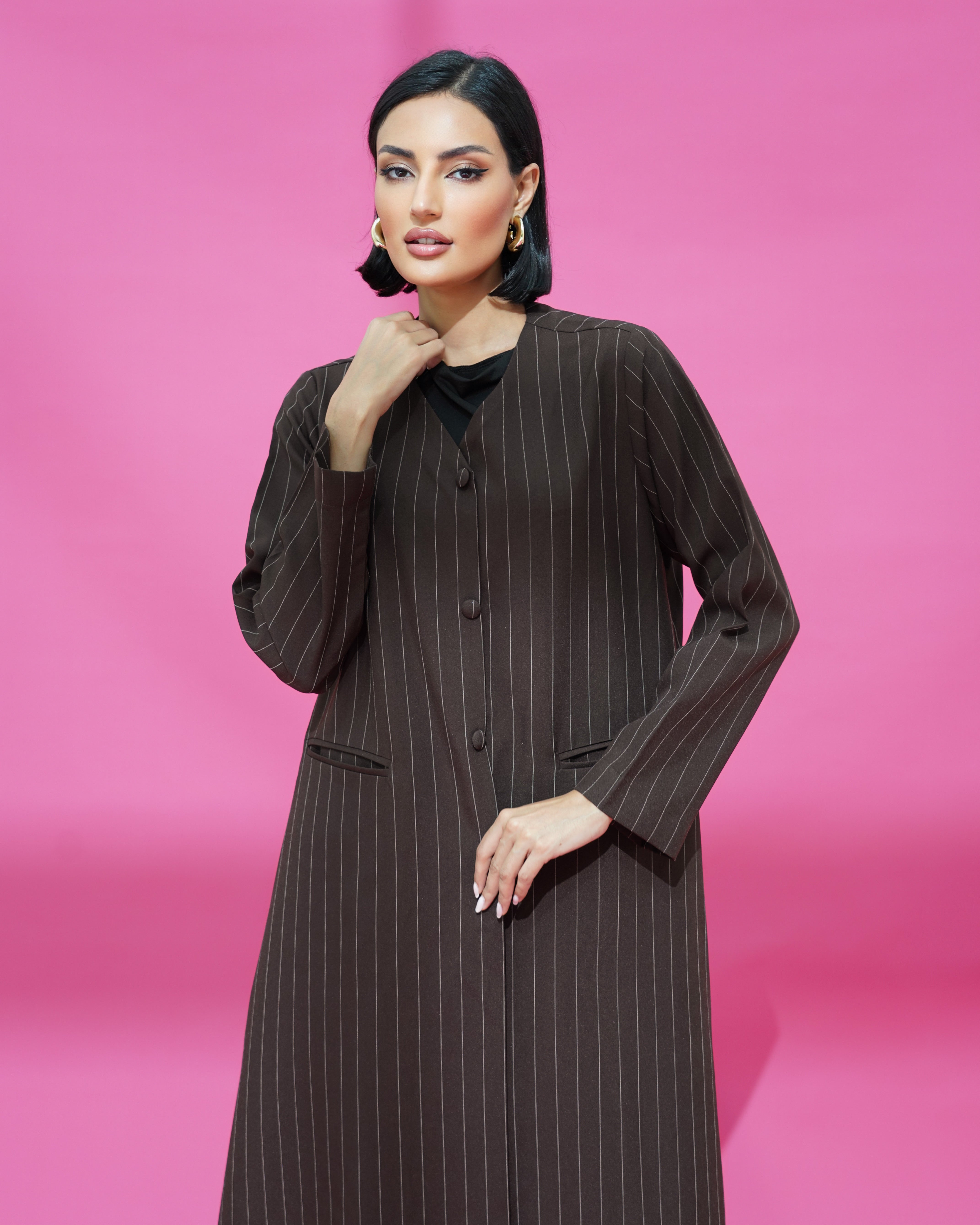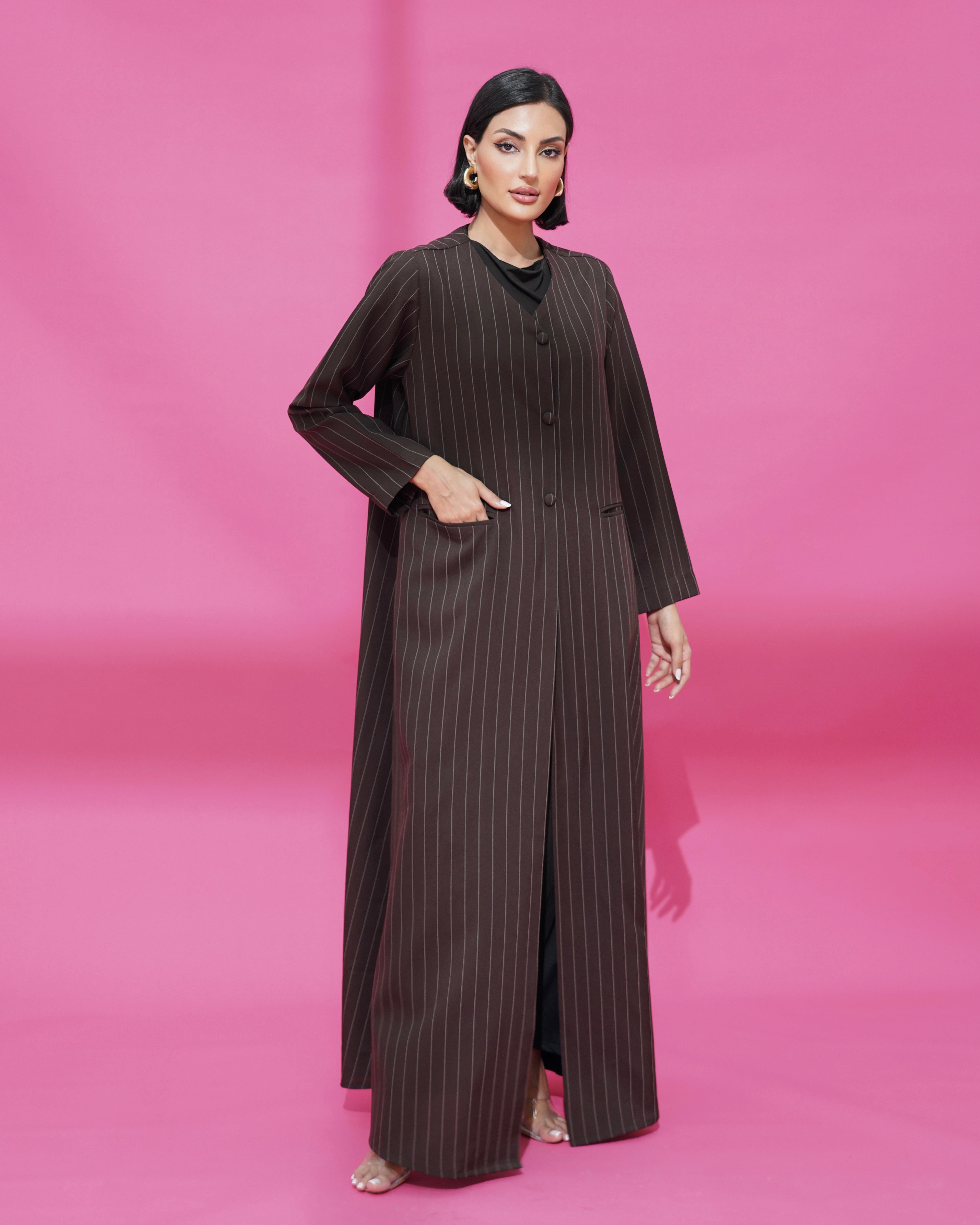 sophisticated striped abaya, this abaya elongates the figure beautifully while maintaining a polished, professional look. The button-down front and clean lines make it perfect for workwear, formal gatherings, or an effortlessly chic everyday outfit.