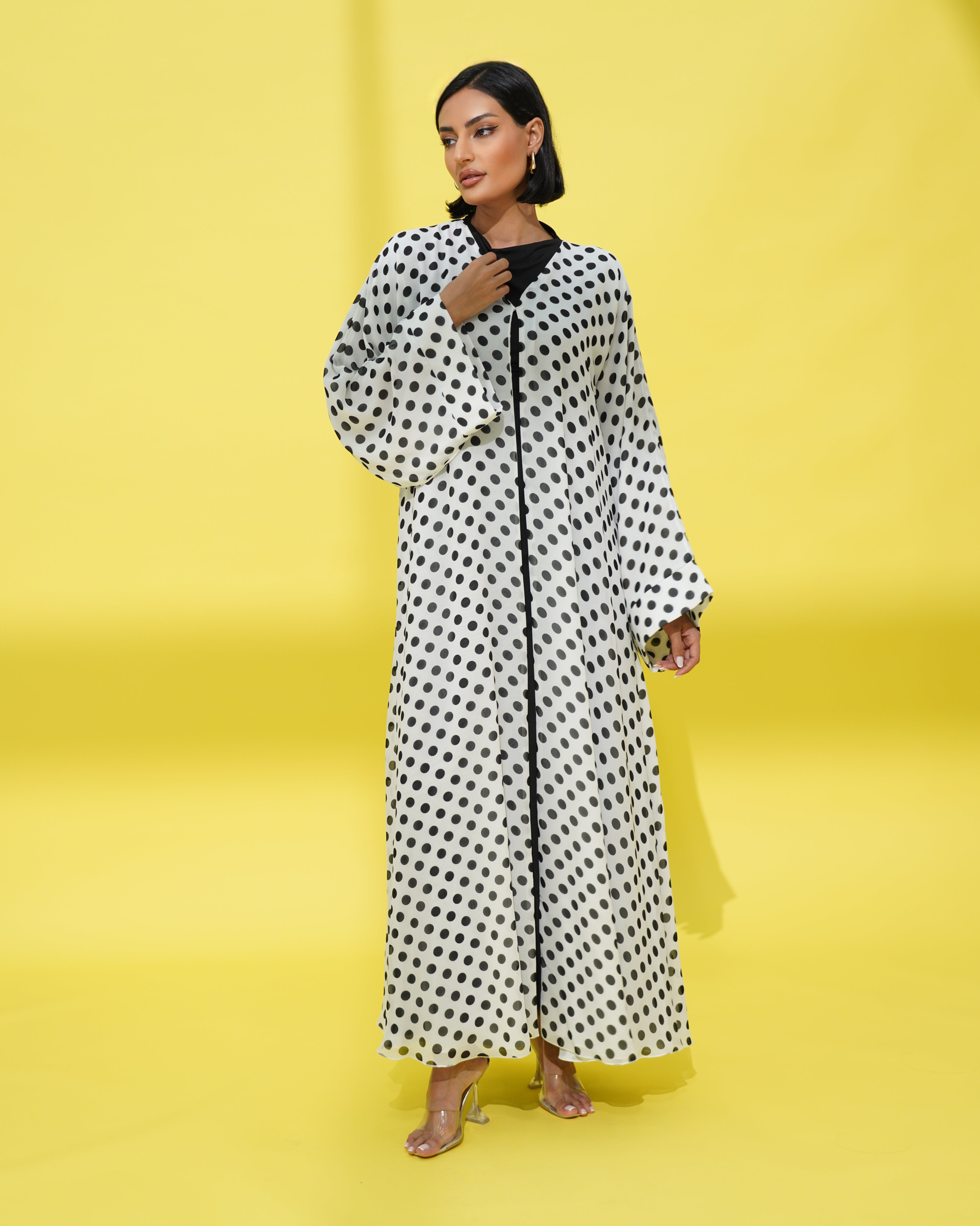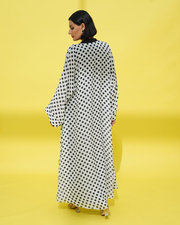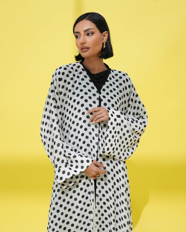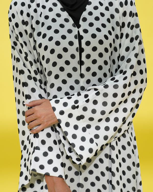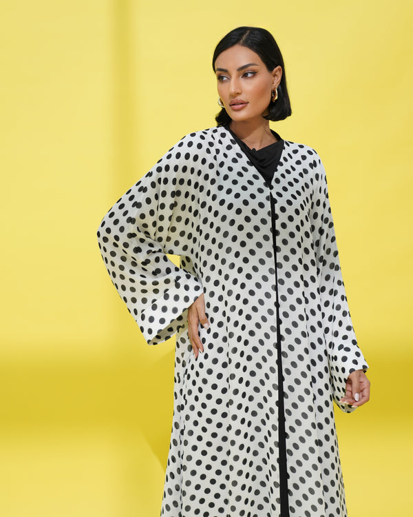 Add a touch of modern elegance to your look with this luxurious abaya, designed with Black polka dot patterns on a chic White background.