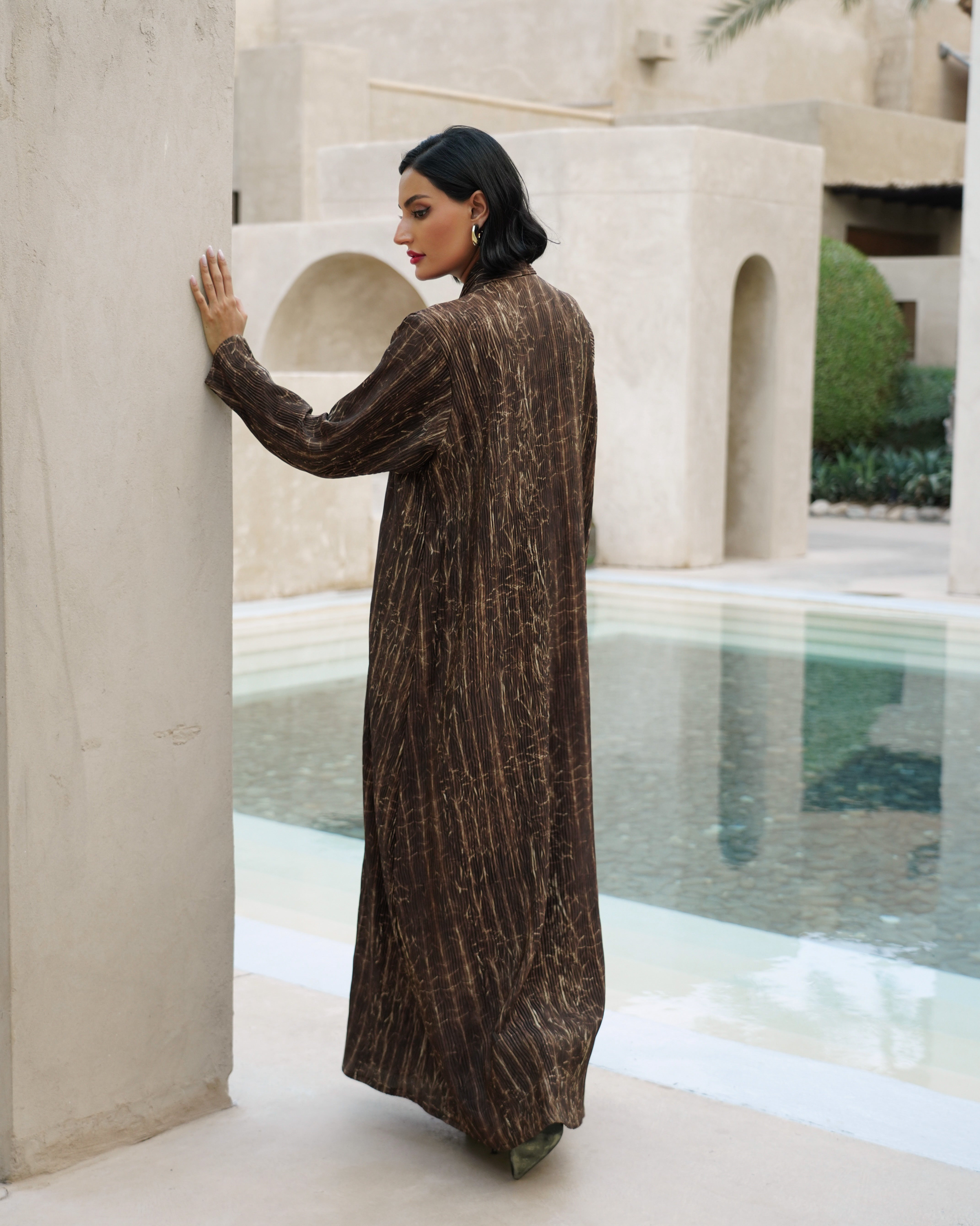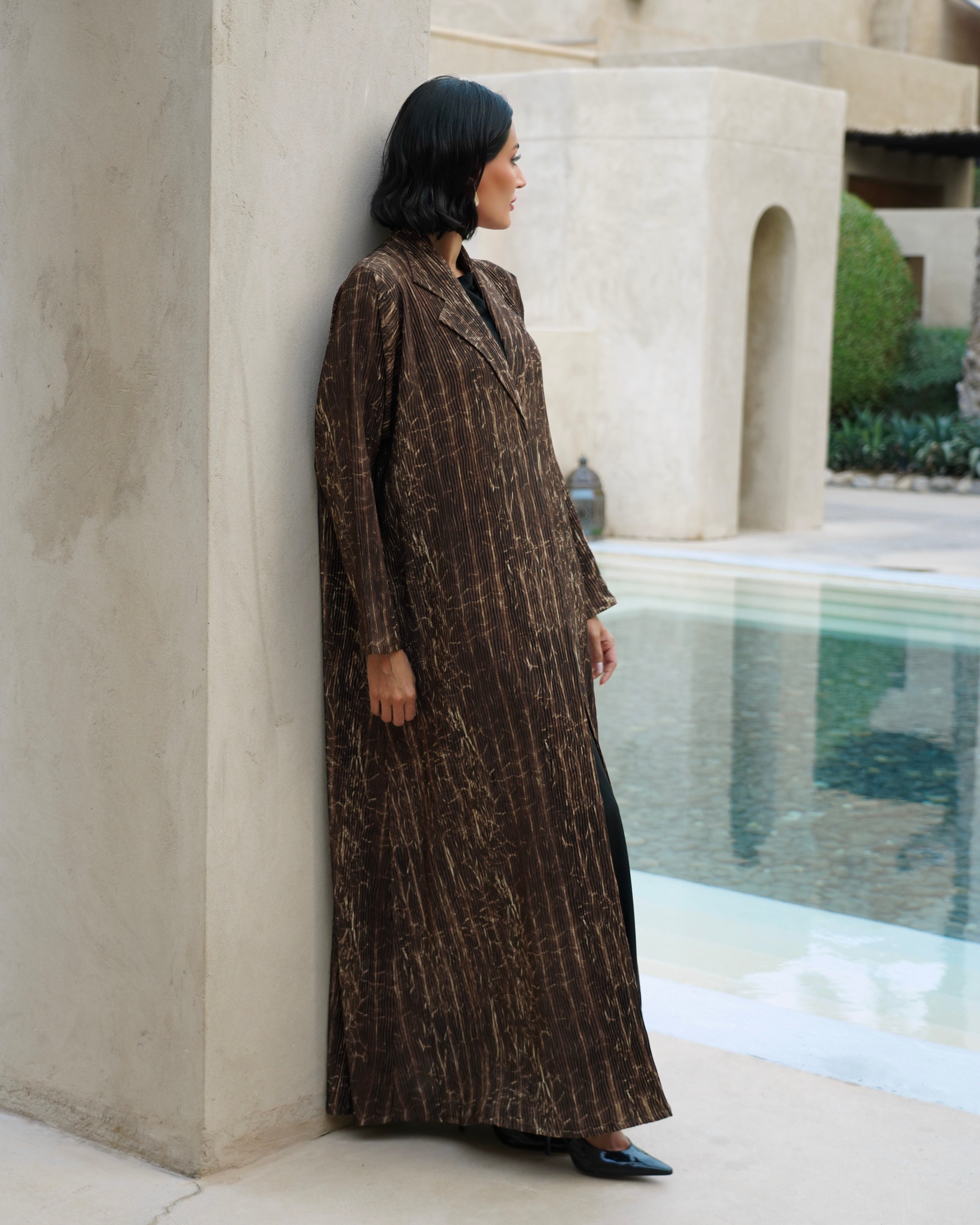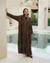 An abaya crafted from soft fabric with a distinctive texture, featuring a subtle linear pattern that adds a sense of flow and elegance.