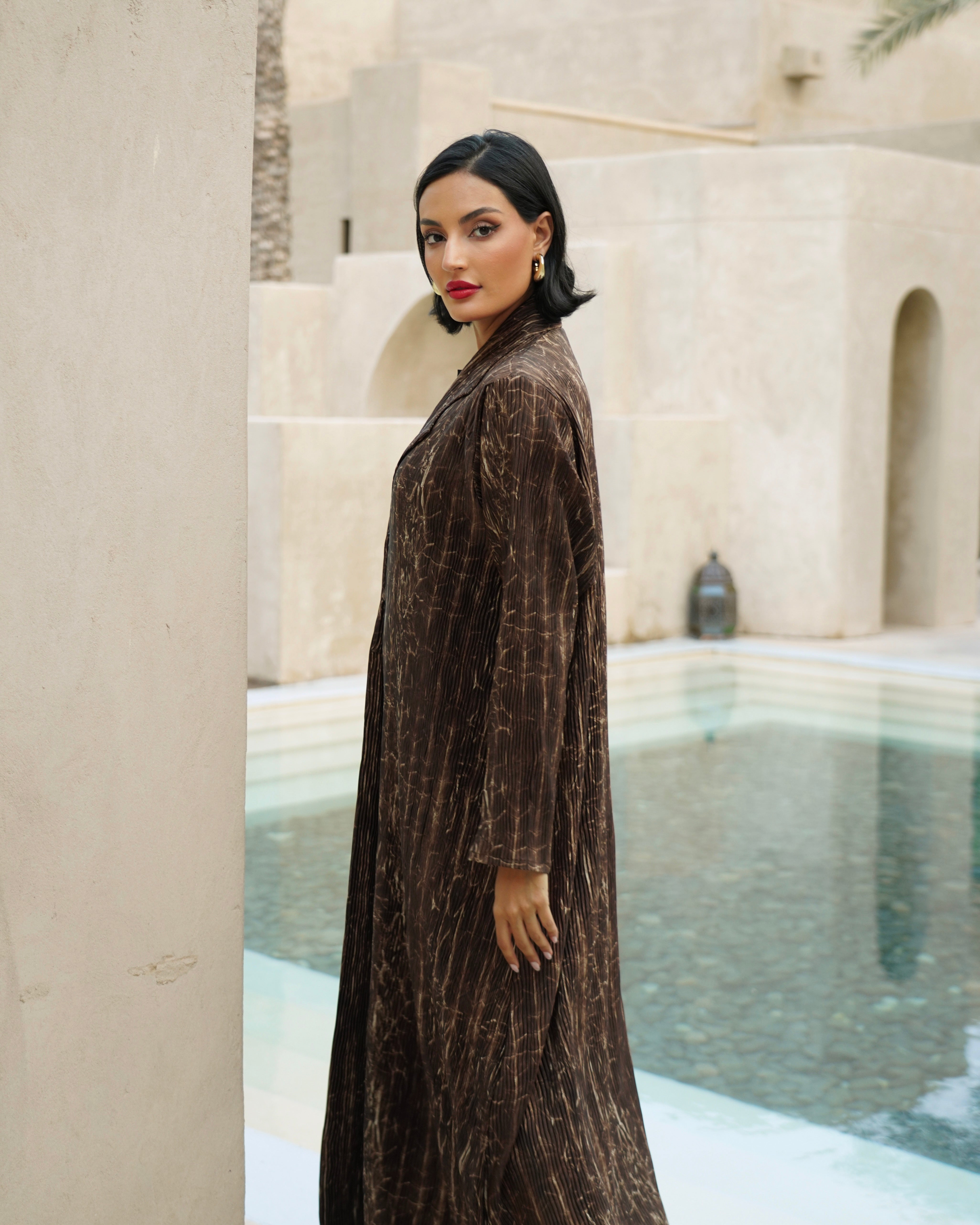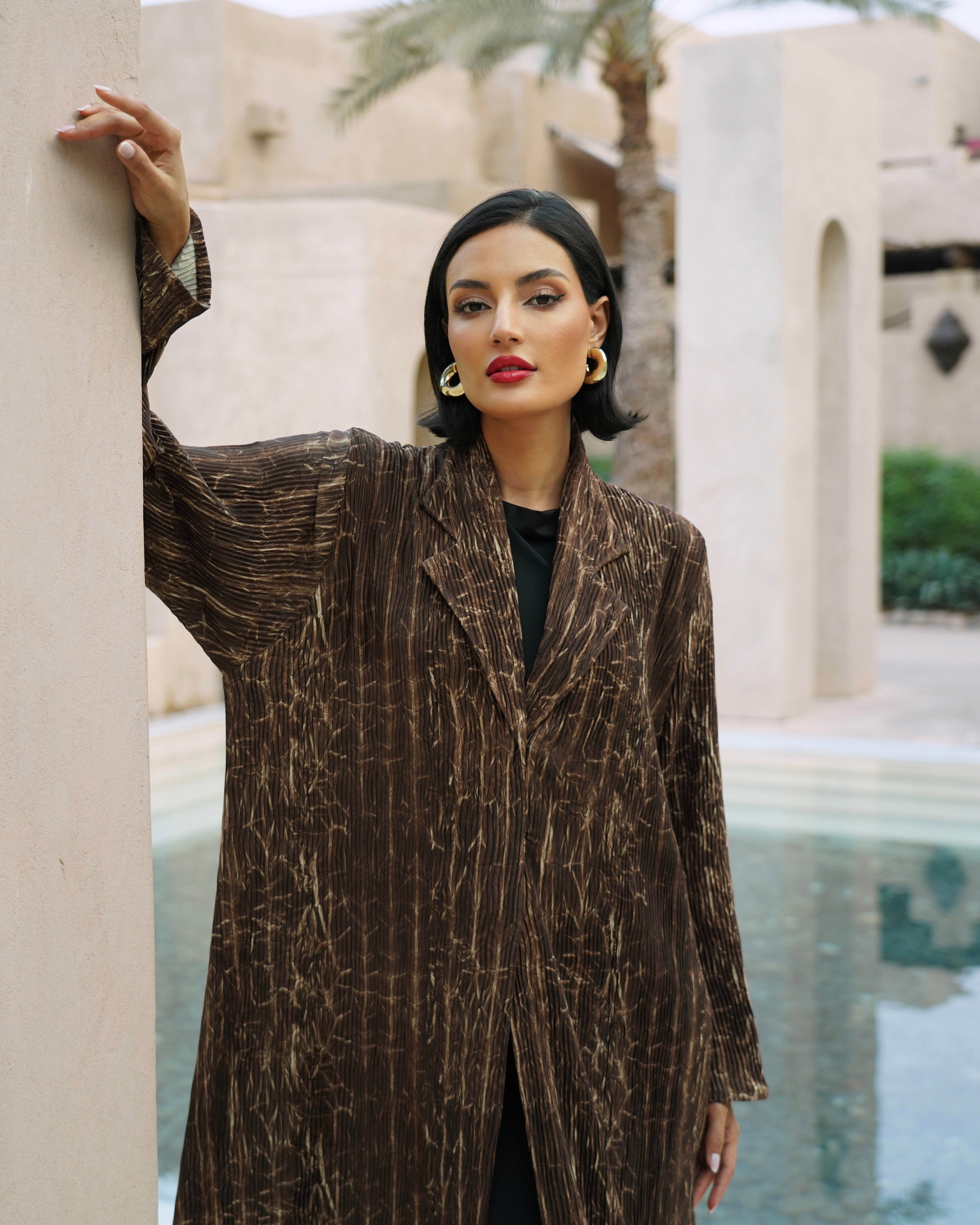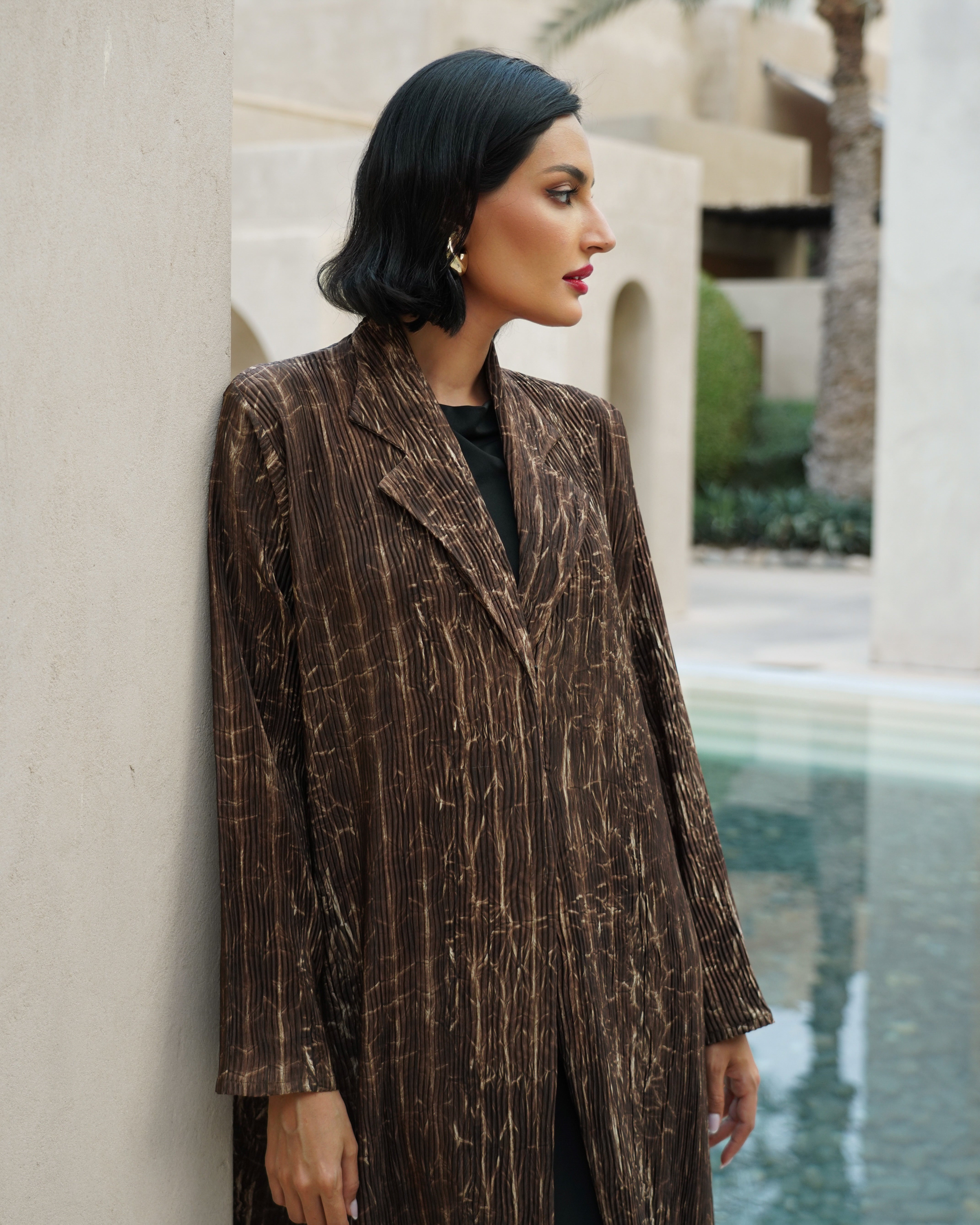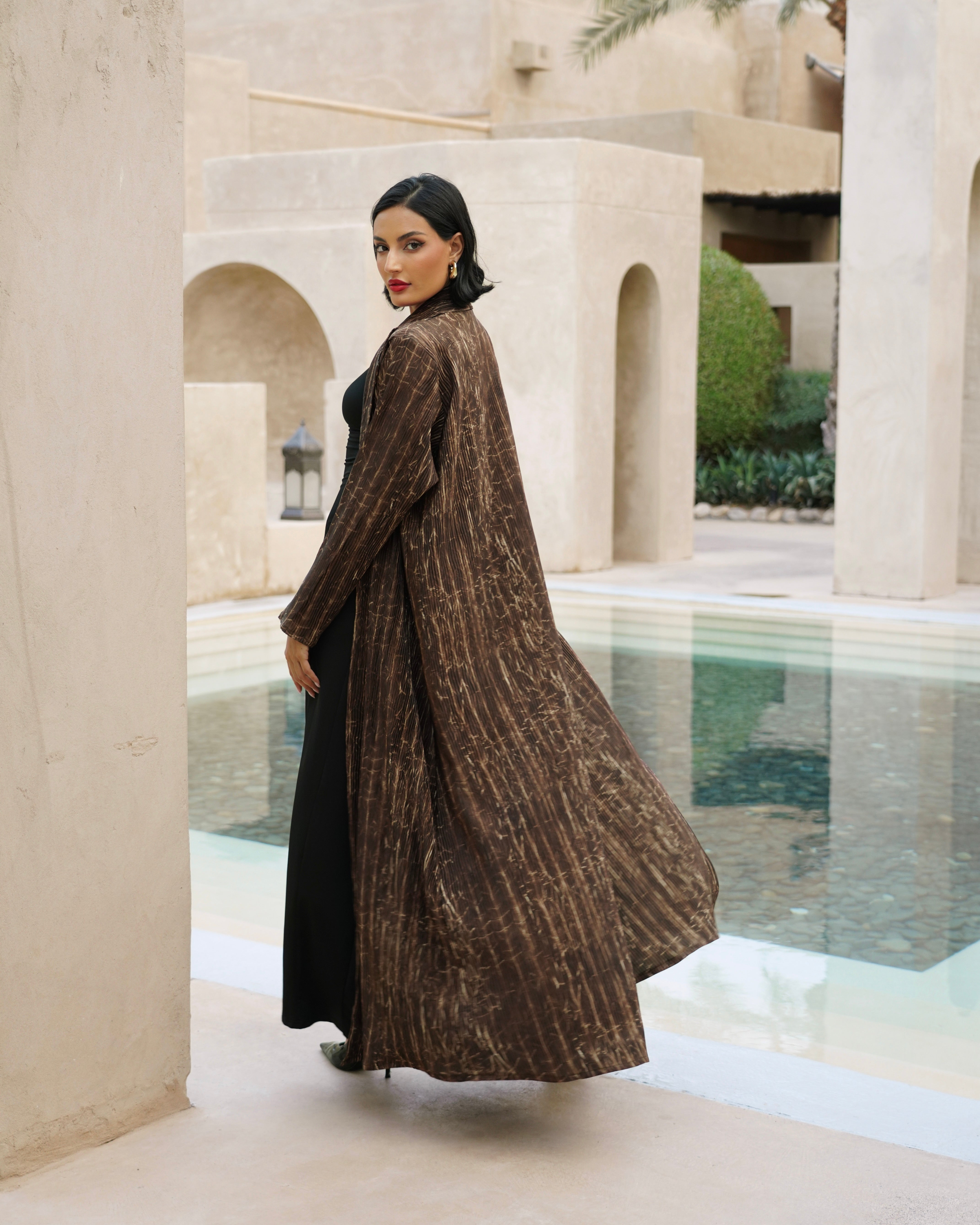 عباية مصنوعة من قماش ناعم بخامة مميزة، تتميز بنقشة خفيفة على شكل خطوط طولية تضيف إحساسًا تصميمها راقٍ وبسيط،.