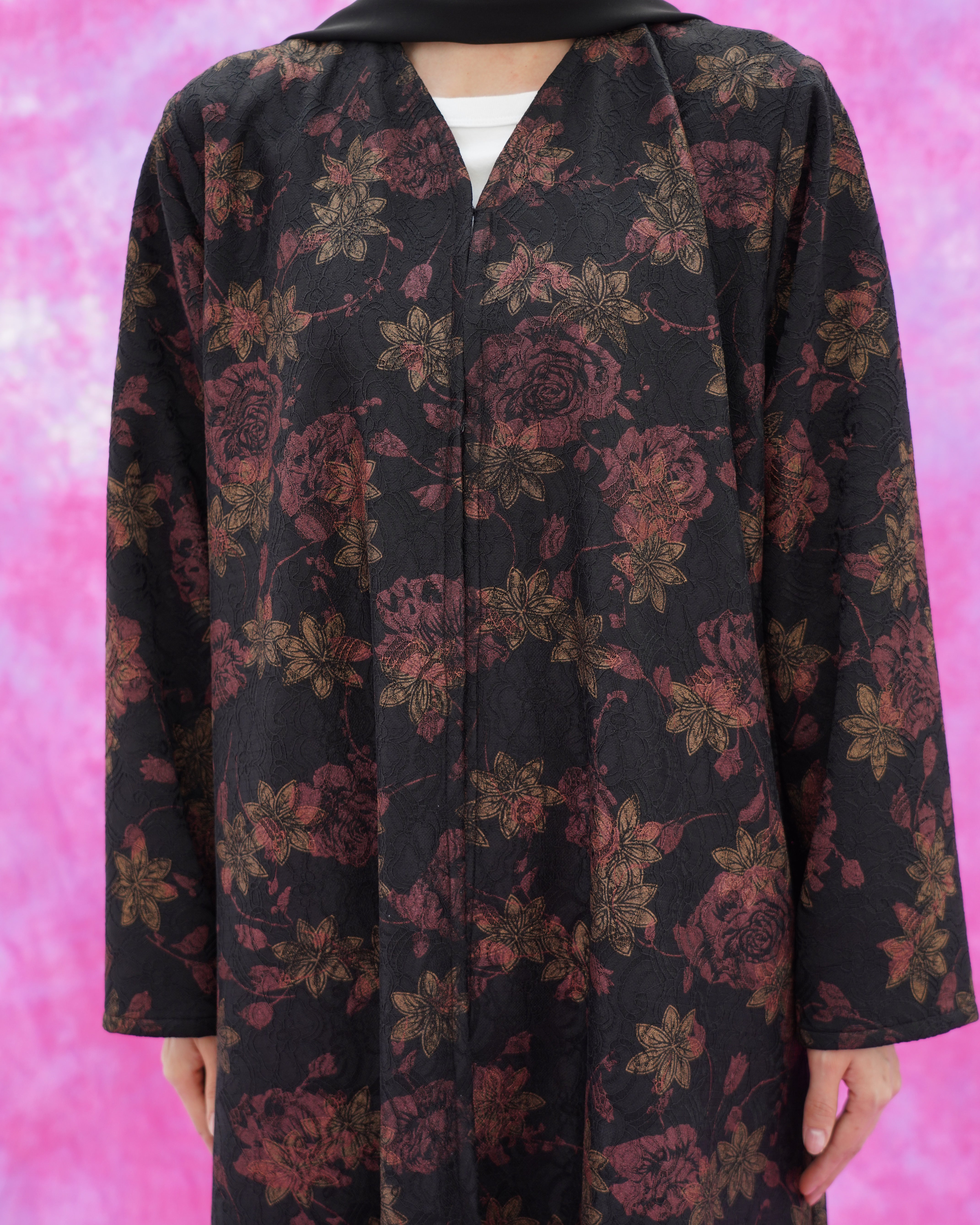 A black abaya with an elegant floral pattern that adds a soft, feminine touch. Designed with a flowing, comfortable silhouette and wide sleeves for a refined and graceful look. A perfect blend of classic and modern style, ideal for both everyday wear and special occasions.
