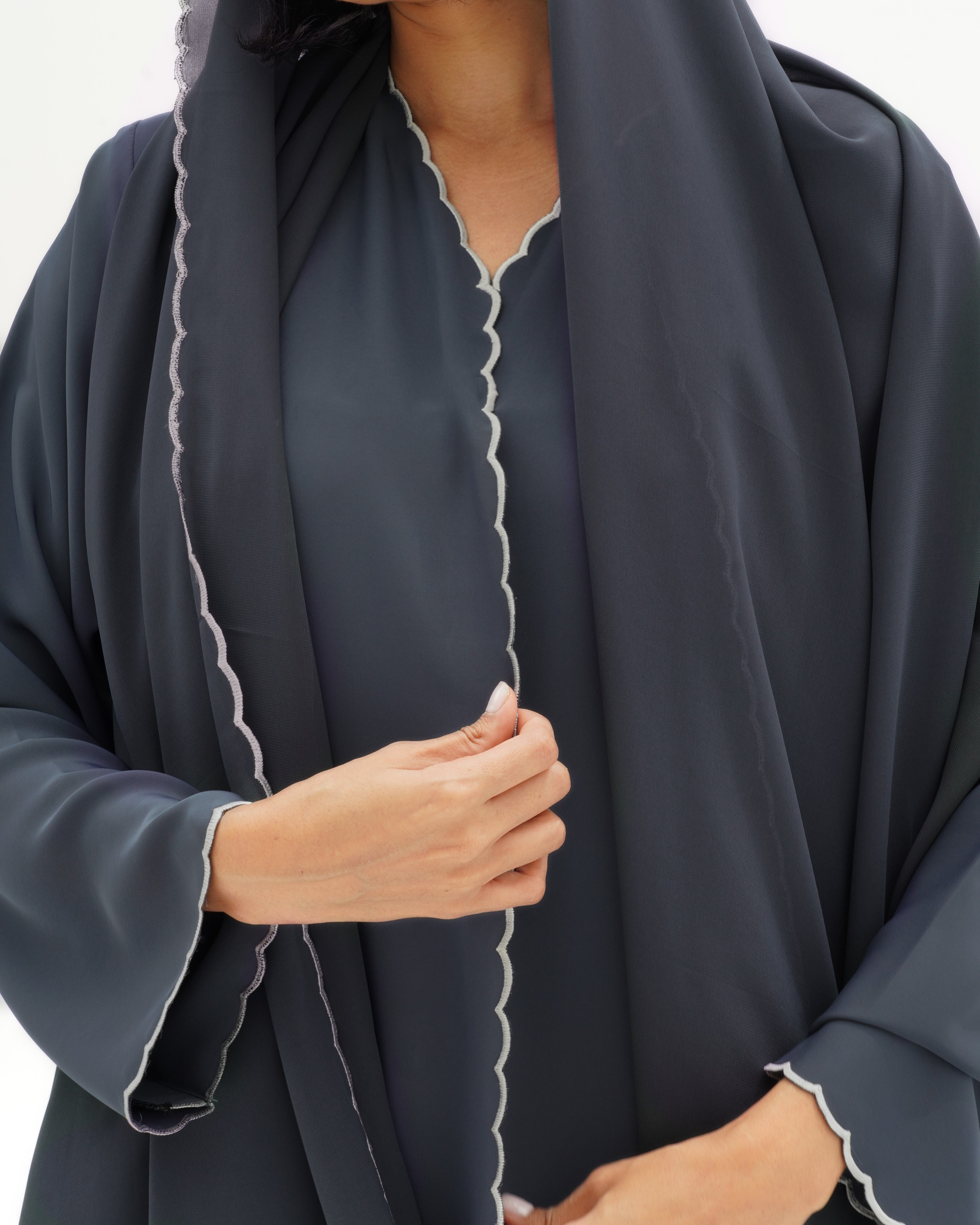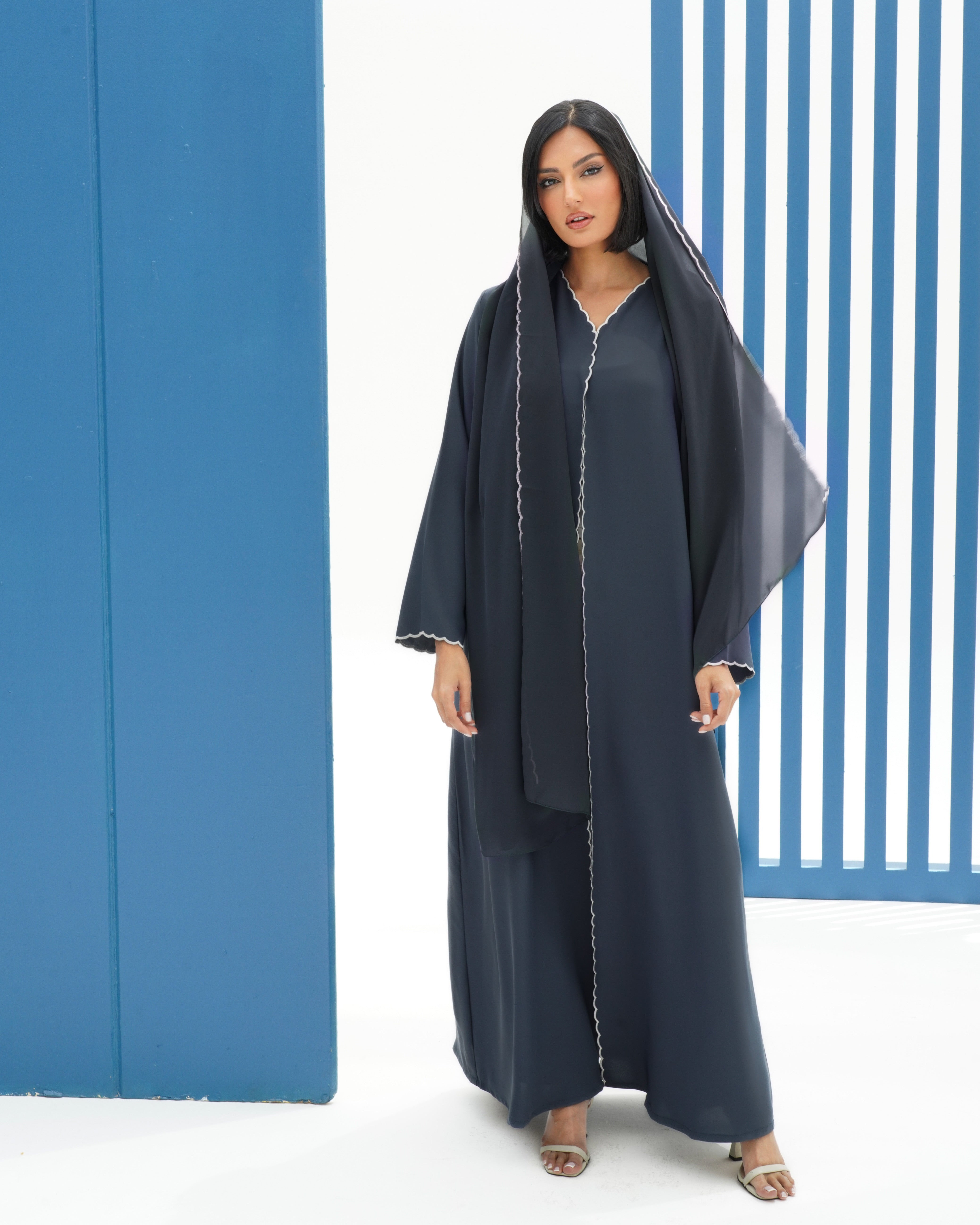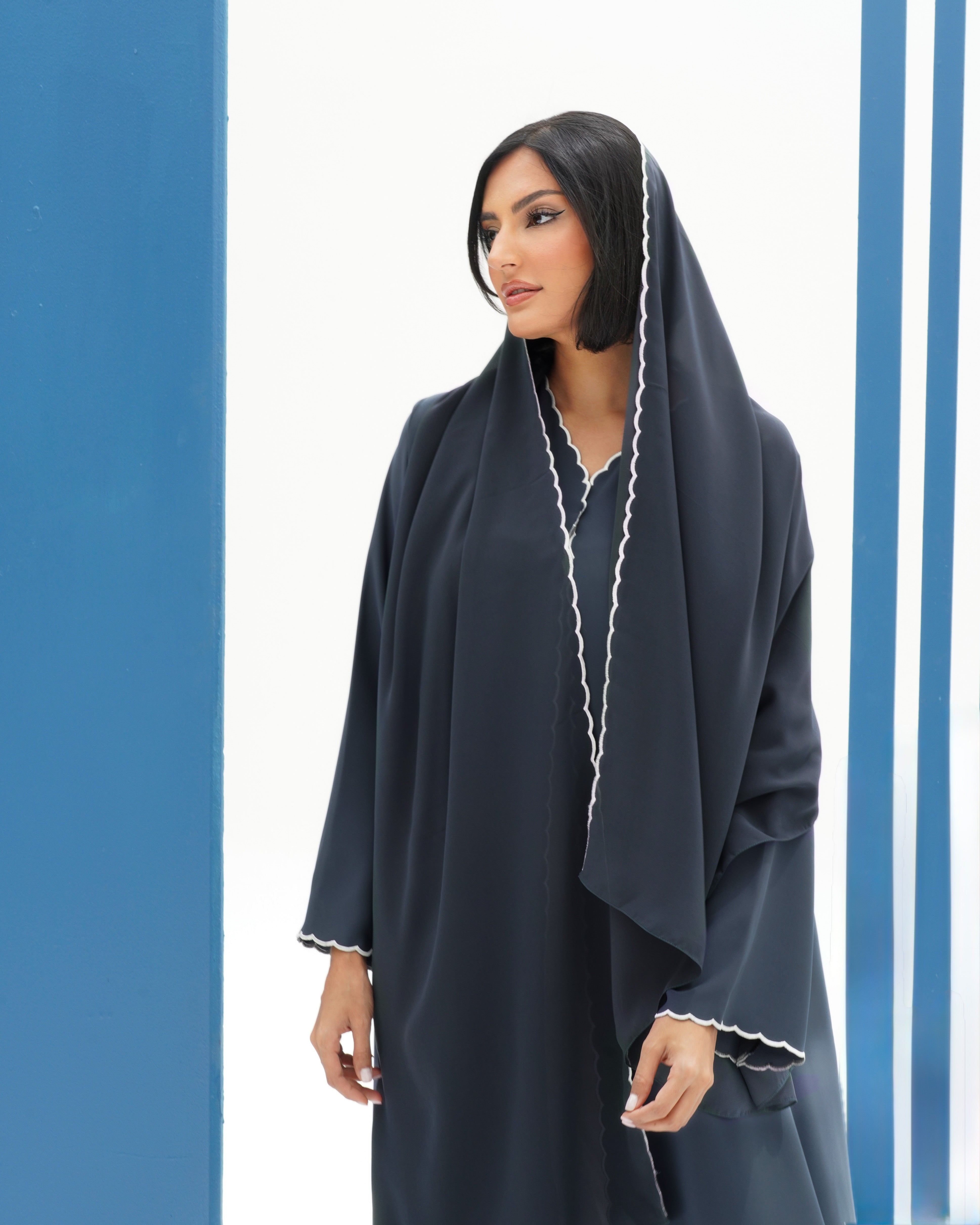 Abaya made of Nada fabric, featuring a flowy design with wide sleeves, adorned with white wavy edges, and paired with a matching sheila with the same details.