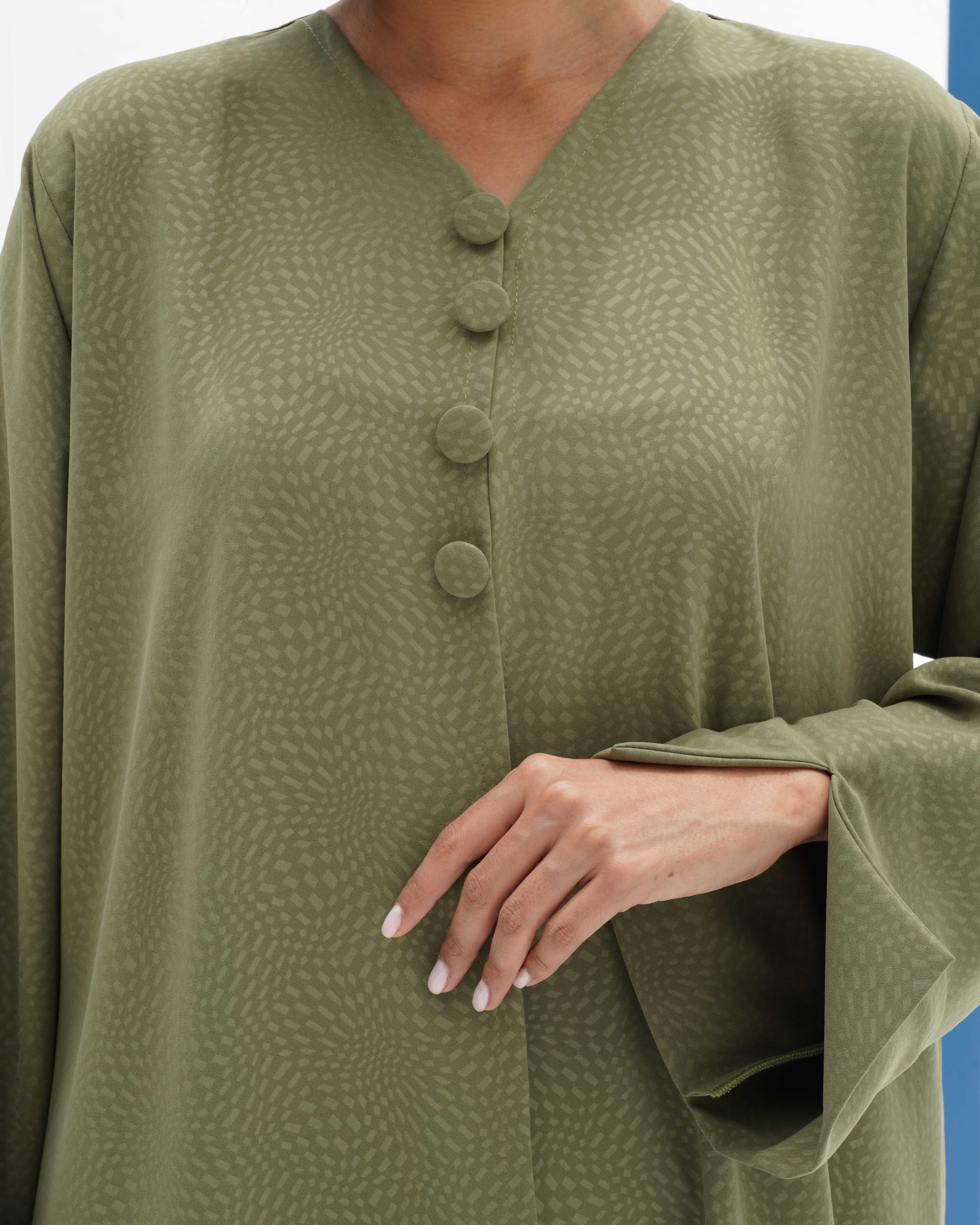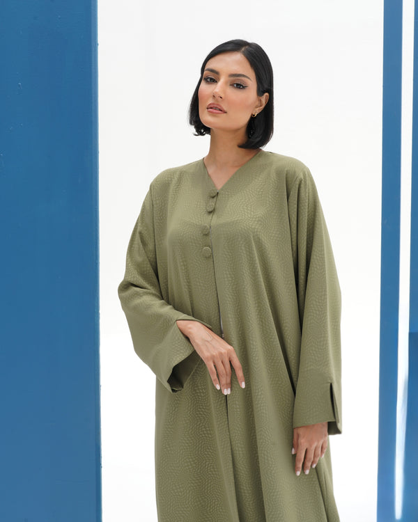 عباية أنيقة من قماش كريب فاخر بنقشة ناعمة، بتصميم انسيابي مع أكمام واسعة بفتحة جانبية وأزرار طقطق عصرية من الأمام.